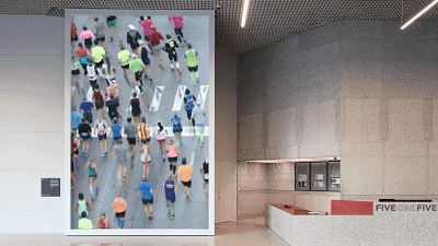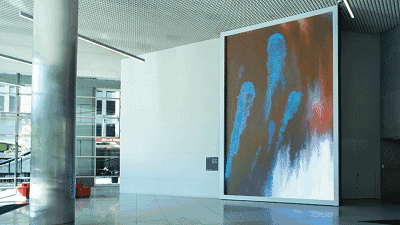 从具象的城市生活片段不断地过渡到抽象,然后又回到具象、清晰的视频图像。不仅给首层大厅创造了全新的体验,吸引每一位进入大厅的人驻足欣赏,同时从街道上透过建筑物的玻璃立面便能看到高耸的装置,也赋予了这座城市新的艺术活力。