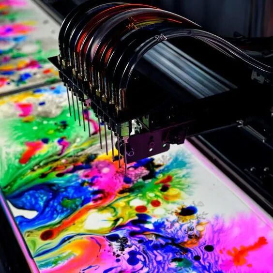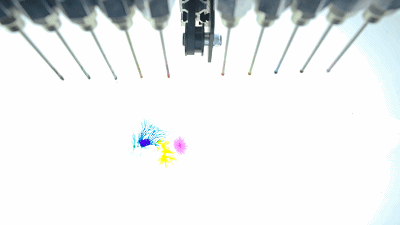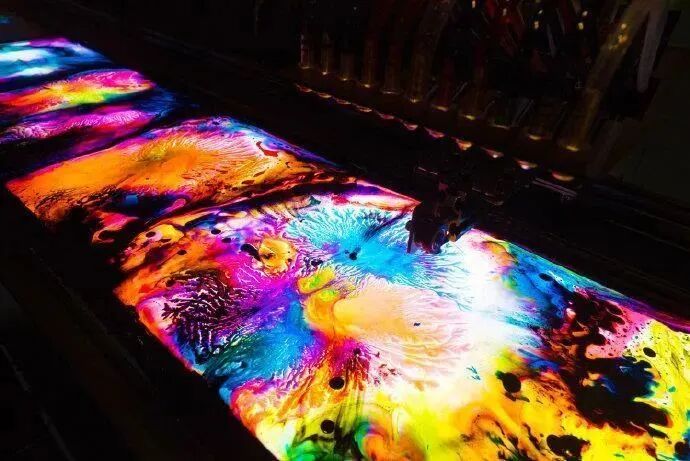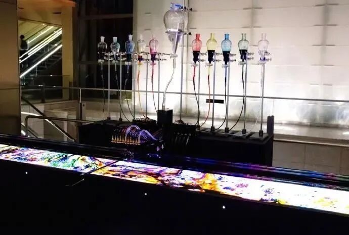 《dyebirth》是日本创意团队 studio nor 创作的一件动态装置。玻璃颜料机械装置在操作台上不断移动,不同颜料会滴落在下方水槽中,各色颜料混合并向四周扩展,创造出各种有机图案,形成一幅赏心悦目的艺术绘画作品。
