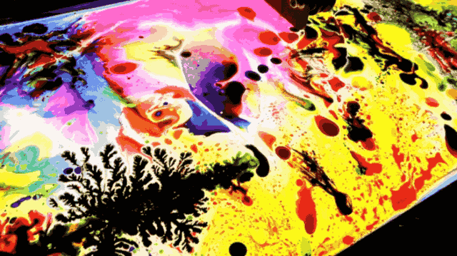 “粘滞指进”是指:当不同粘度的液体或颜料混合在一起,会向四周扩散,出现一个分形的图案,容易让人联想到树枝或河流等。