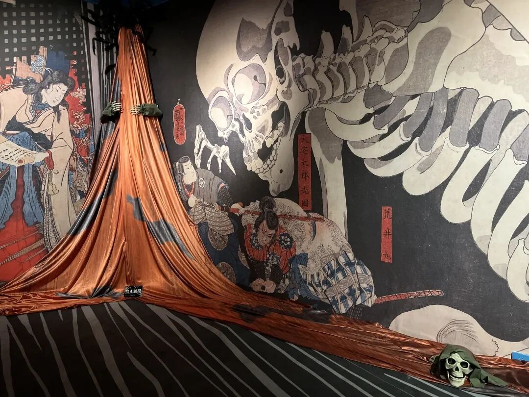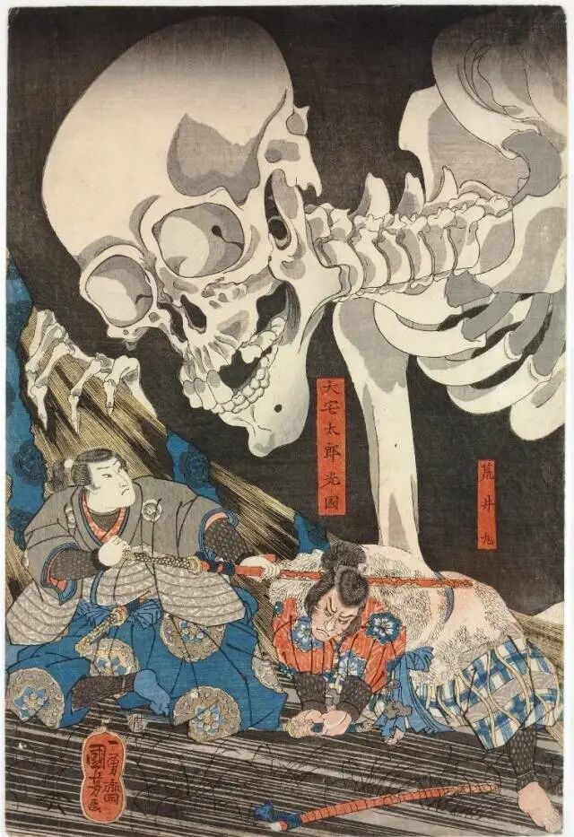 这幅画最惊人之处,在于其中骷髅的透视之准确。歌川国芳喜欢收集西方的版画,大概这个骷髅之所以这么准确,跟他的收藏有关系。