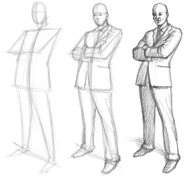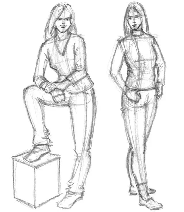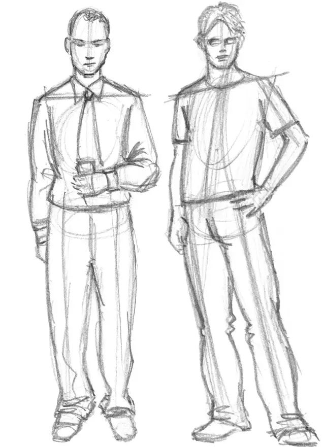 接着可以把人物的轮廓画在有角度和比例的坐标上了,并使人物的框架显得立体丰满。躯干、胳膊、腿和脚只画出粗糙的形状,衣服上有了一些基本的细节。