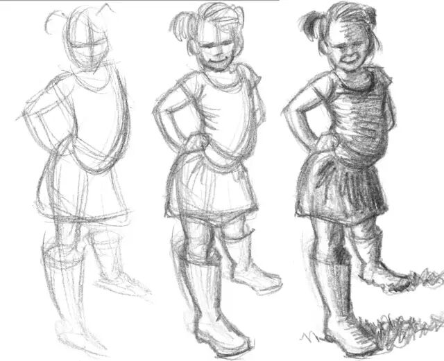 小女孩姿势:自信的倾斜的头部、向前突出的小腹、前腿那侧翘起的髋部。画草图时,力求捕捉所有这一切特征,同时迅速地勾画更多的细节。