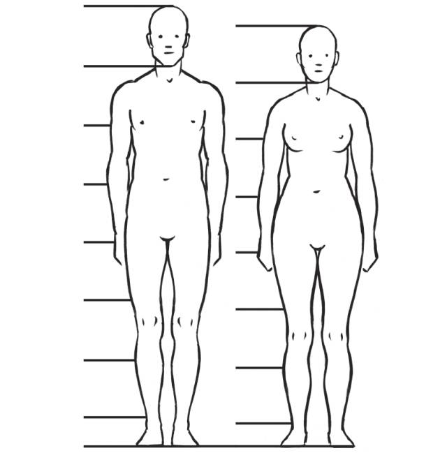 姿势和体形很正式,有弧度。首先在躯干的中央画一根弧线,表现向后倾斜的姿势。然后画出头部的形状、肩膀的轮廓、身体的角度和肩部以下的胳膊。再往下就是画腿部简单的线条,体形要处理得恰当均衡,身体比例要合适。