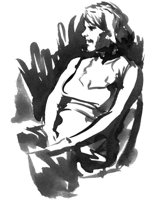 使用了稀释的墨水和笔刷,捕捉人物微妙独特、引人注目的姿态。画我女儿的时候,我分两步使用墨水:先用稀释的墨水快速画出轮廓和阴影,接着以更丰富的墨彩仔细地处理细节。