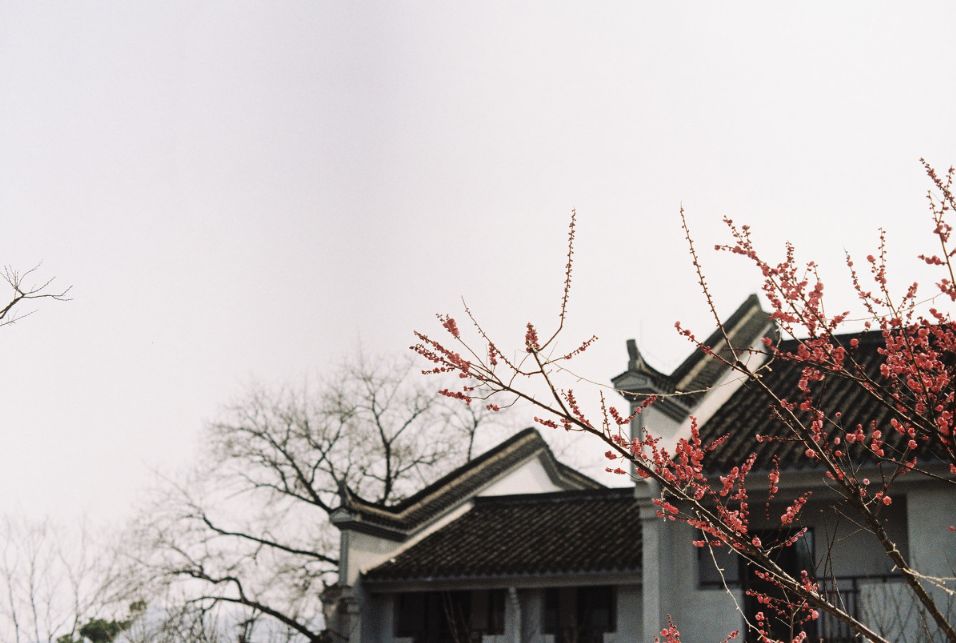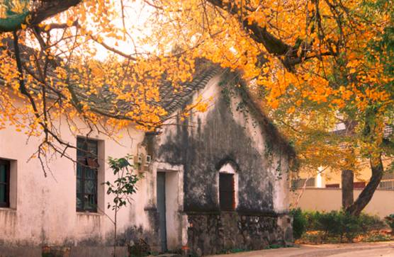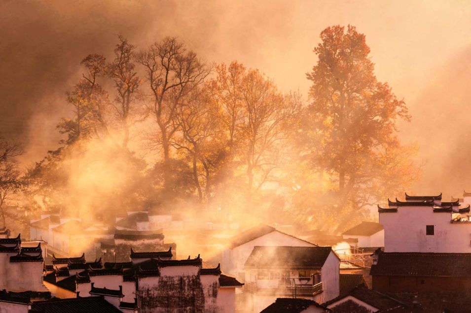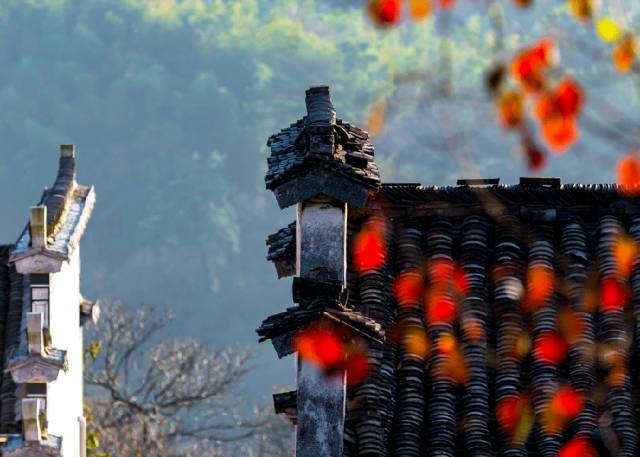秋天的石城,斜阳尽撒,一层晨雾悬挂在树腰,红枫和灰白色徽派建筑在雾中若隐若现。