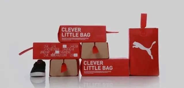 伊夫·贝哈尔的设计公司Fuseprojec,为彪马设计的这款鞋盒,由一个可重复使用的袋子和瓦楞纸构成,此款设计减少了传统鞋盒65%的用料。