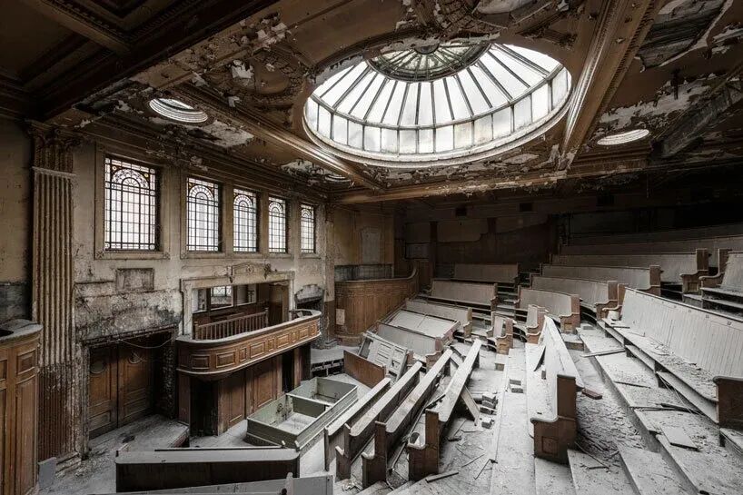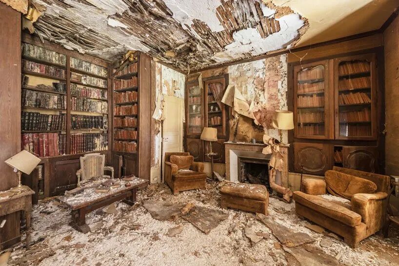 作者的照片总是在奢华和腐朽之间形成鲜明的对比,错综复杂的绘画和宏伟的房间与成堆的碎石同时出现,捕捉这些破败的内部空间,迫使观众感觉好像他们也偶然发现了一件被遗忘的艺术作品,而这些艺术作品随着时间的逐渐恶化和流逝很快就会消失。