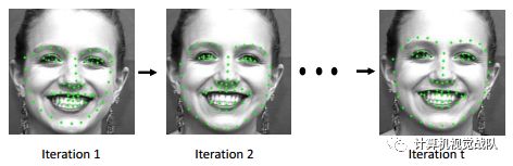 与执行一步预测的直接回归方法相比,级联回归方法从对面部关键点位置(例如均值脸)的初始猜测开始,并通过不同阶段学习的不同回归函数逐步更新关键点位置(如上图)。