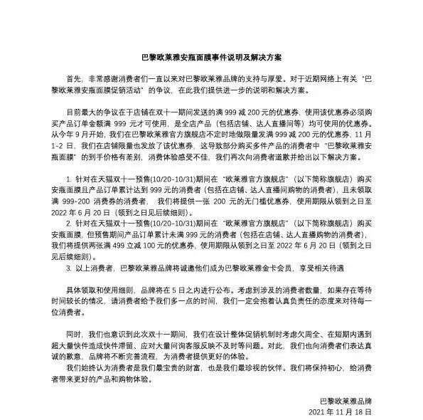 11月18日凌晨2:15,巴黎欧莱雅官方微博发布声明,对“促销机制因过于复杂而给消费者带来的困扰”致歉。在对“薇娅和李佳琦声明”事件作出说明后,声明表示,“我们必须本着对所有相关消费者(包括薇娅女士和李佳琦先生直播间的及其他相关消费者)负责任的态度,巴黎欧莱雅在综合、全面考虑所有相关消费者不同情形后,在保障所有相关消费者利益的前提下,提出能针对所有相关消费者的妥善解决方案。”