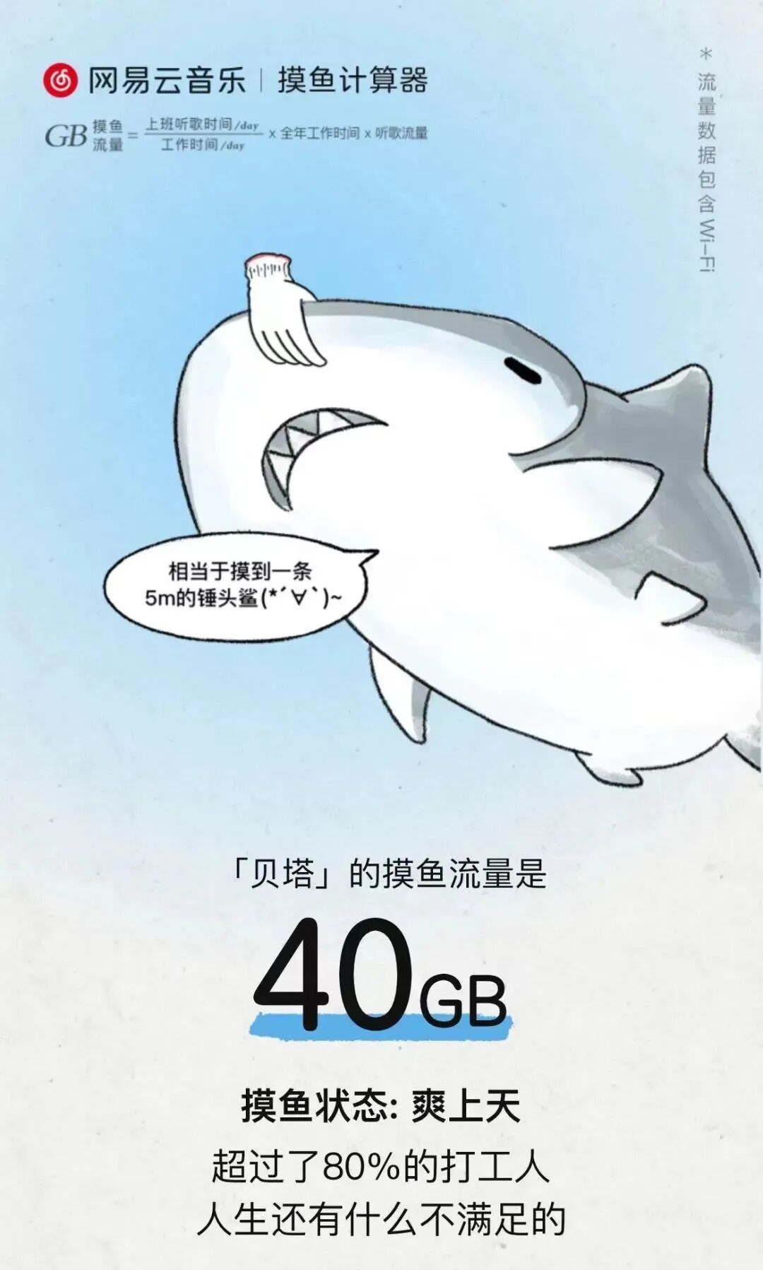 近日,国美发布了《关于违反员工行为规范的处罚通报》通报,以此整治员工摸鱼情况,其中某名员工在网易云音乐上花了 22G 流量,引发了不少网友热议。爆款制造机网易云音乐立马借势,趁机推出「摸鱼计算器」,通过上班听歌时间、工作时间、以及听歌流量,计算出了「摸鱼状态」。