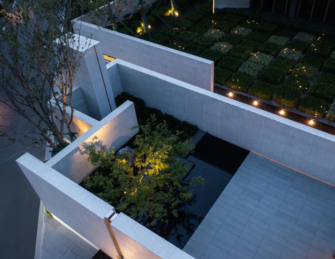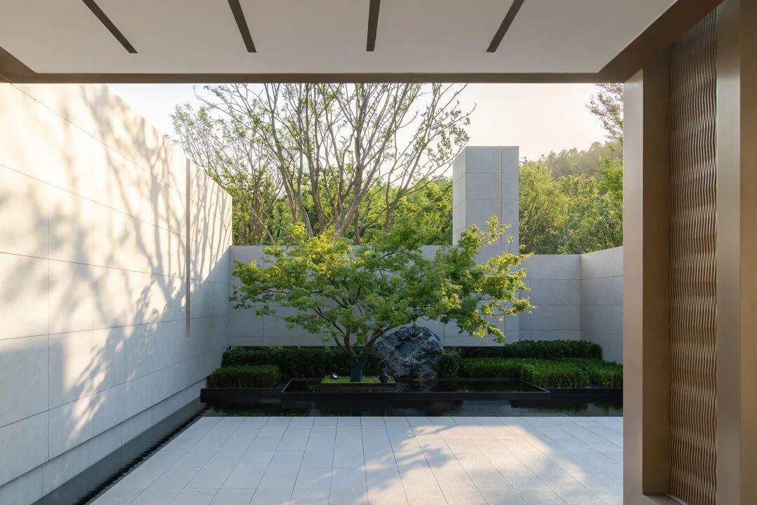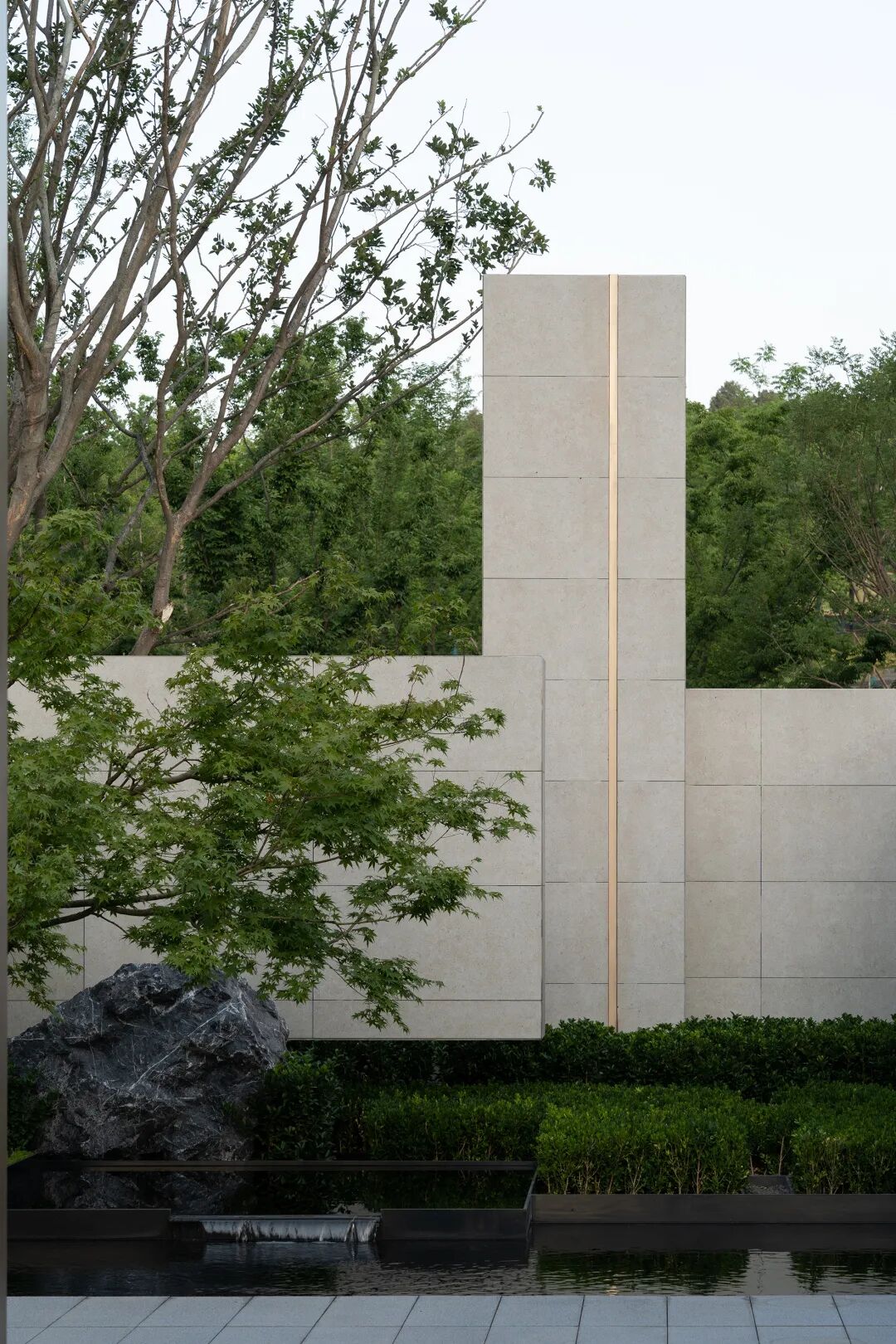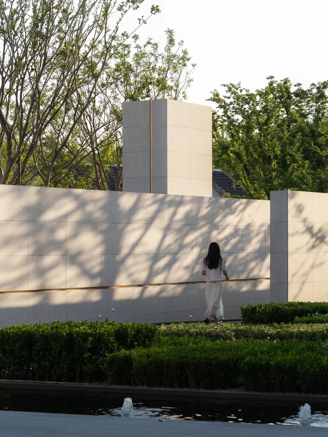 静谧的花园是一道屏障,空间与体块在此交织咬合,线条在空间中自由穿透,参差的绿篱与流动的水面,交织出自然与现代的和谐诗章。