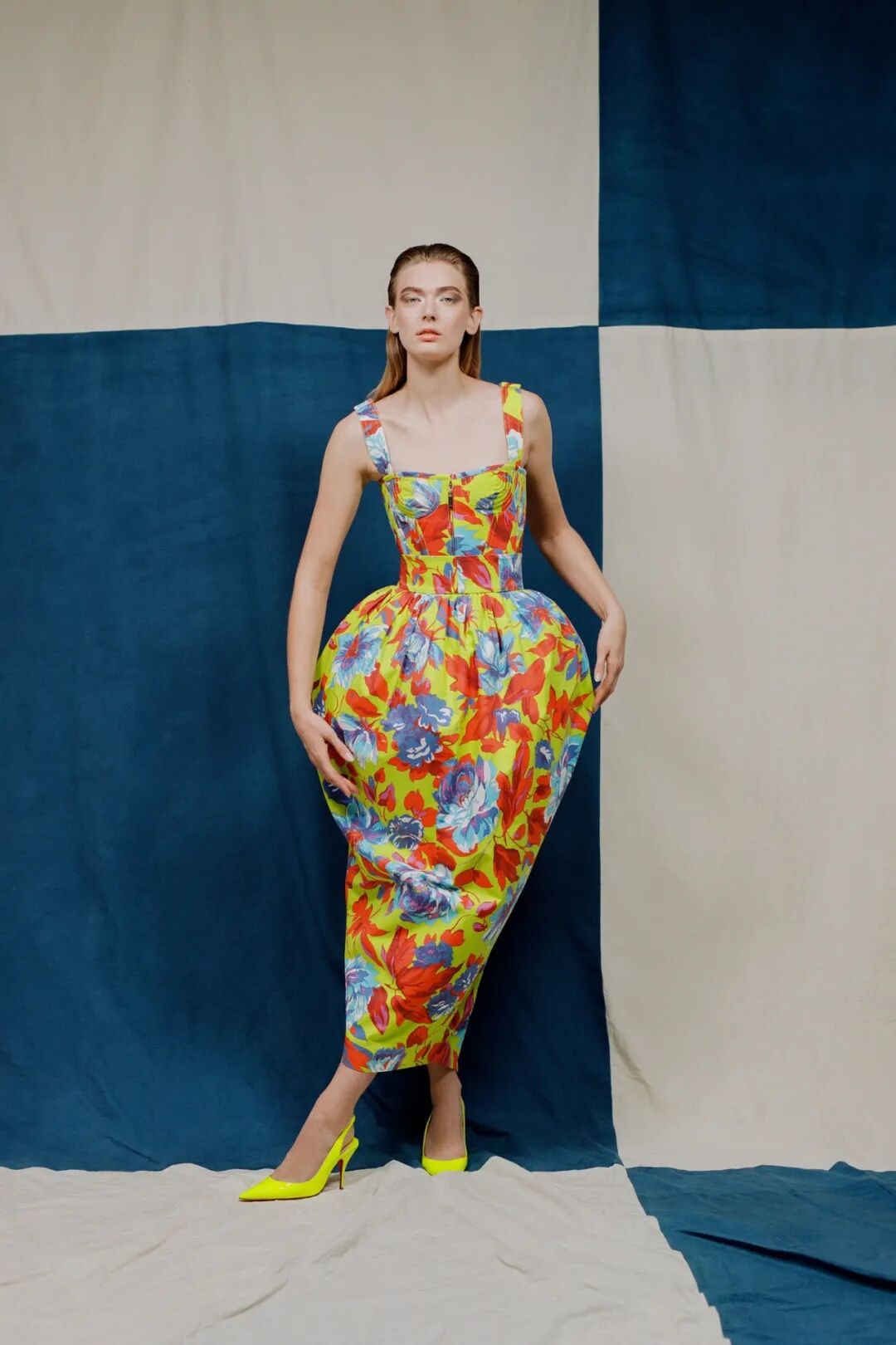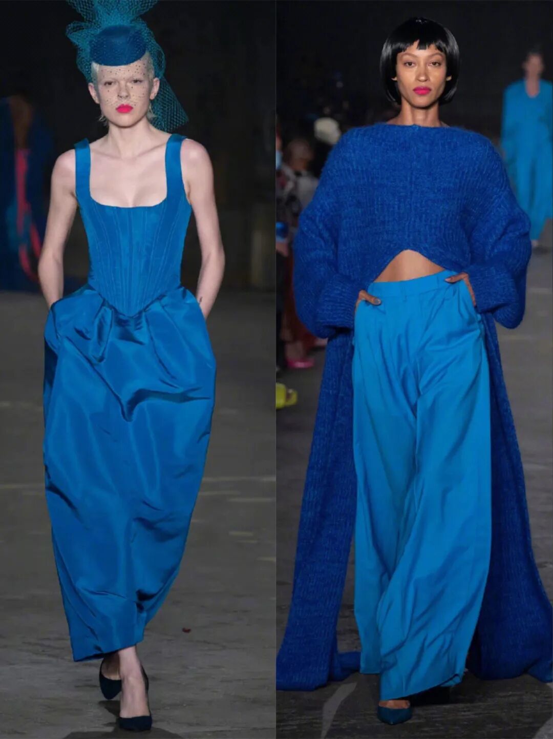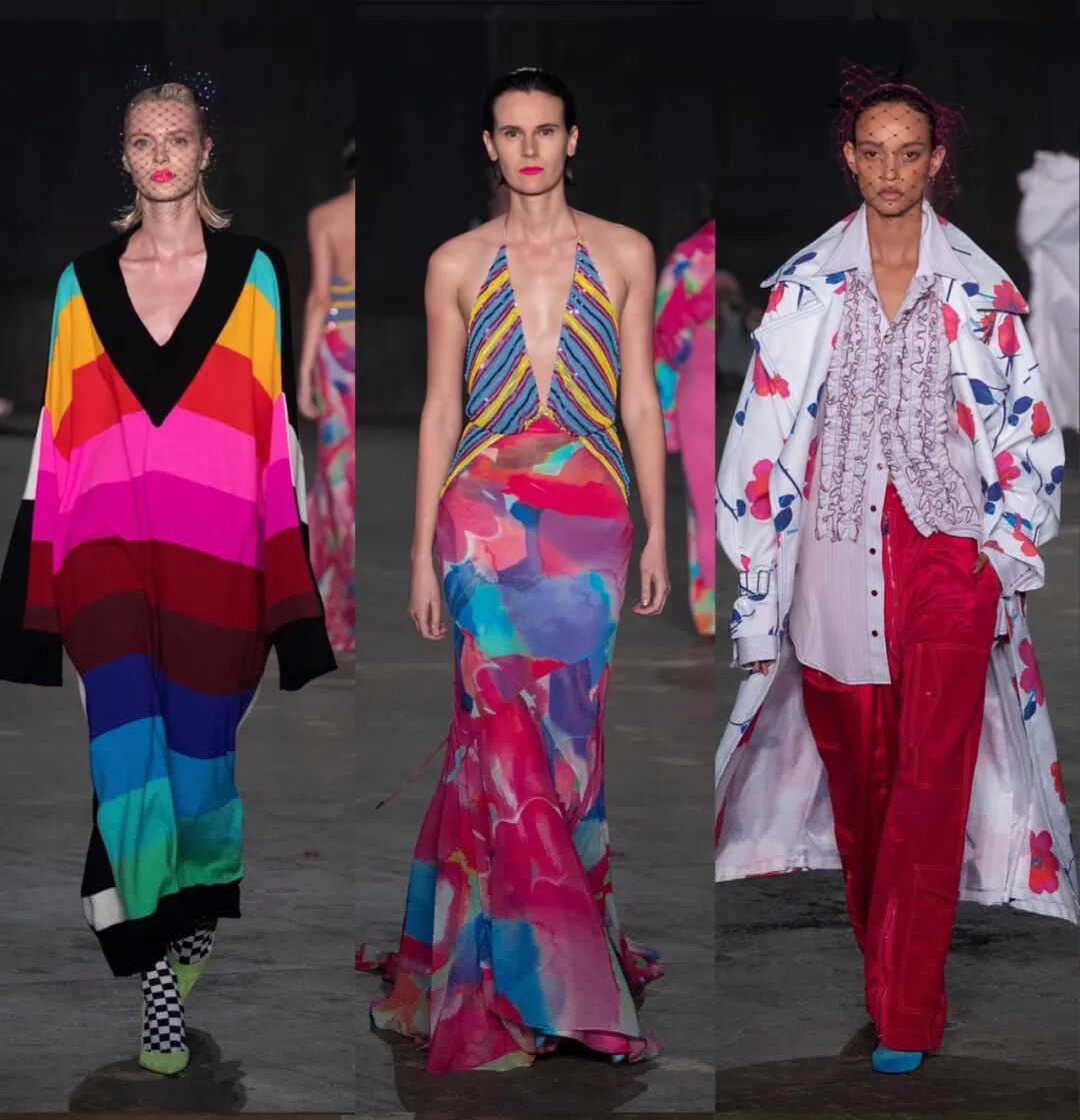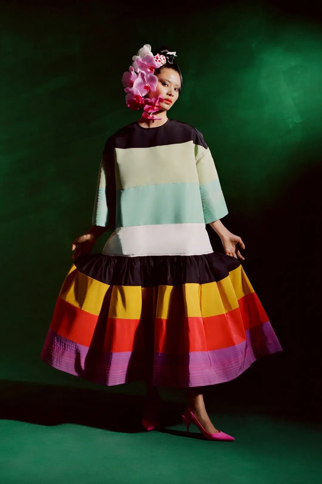 Christopher John Rogers 2023早春度假系列,通过视觉将快乐、多彩呈现在服装中,以表达人们对疫情后回归正常生活的欢欣雀跃。Karlie Kloss身穿紫蓝色大衣开场。整个系列将男性化服装与女性化服装混合,有大胆的花卉印花,也有艺术感十足的色彩和图形拼合,戏剧性十足。