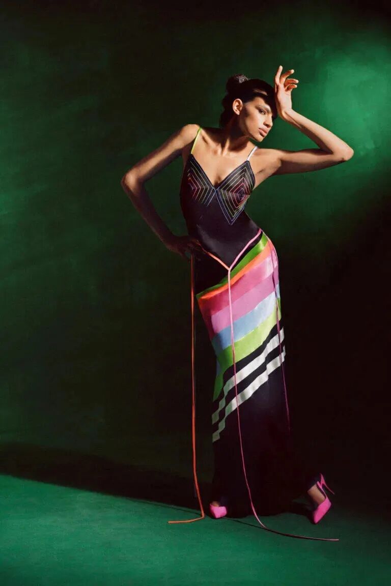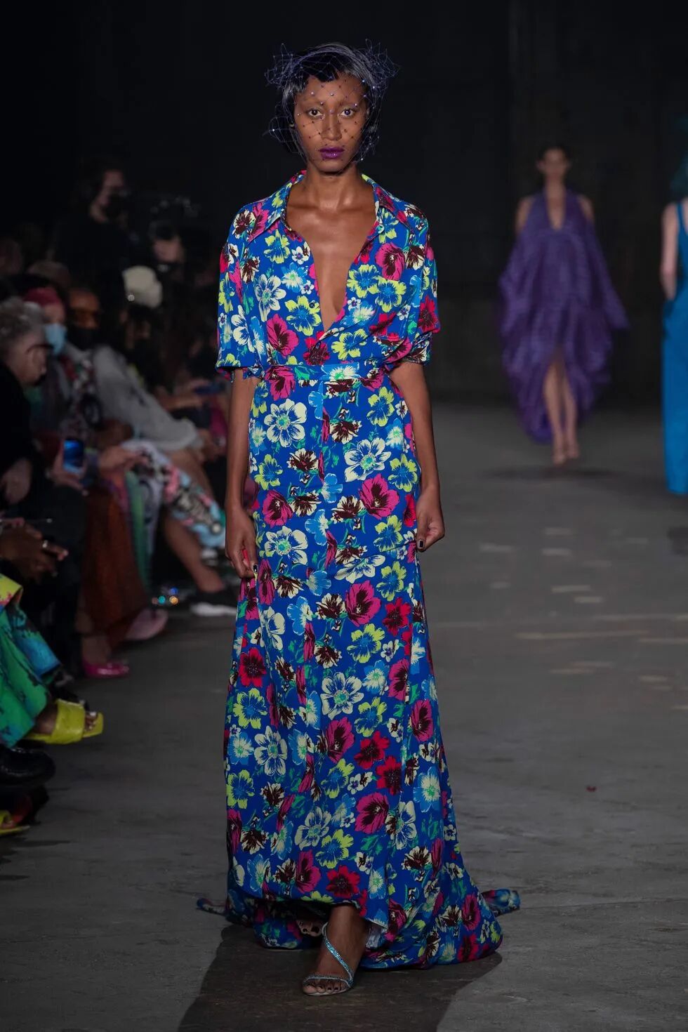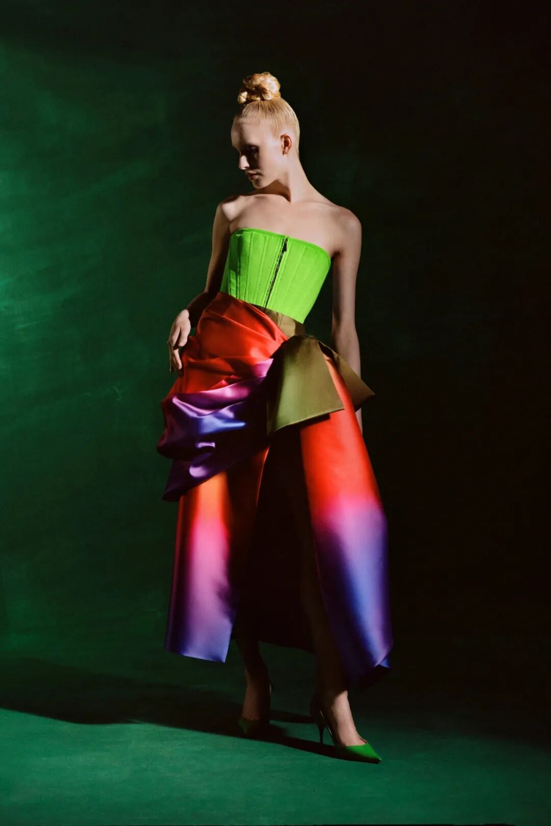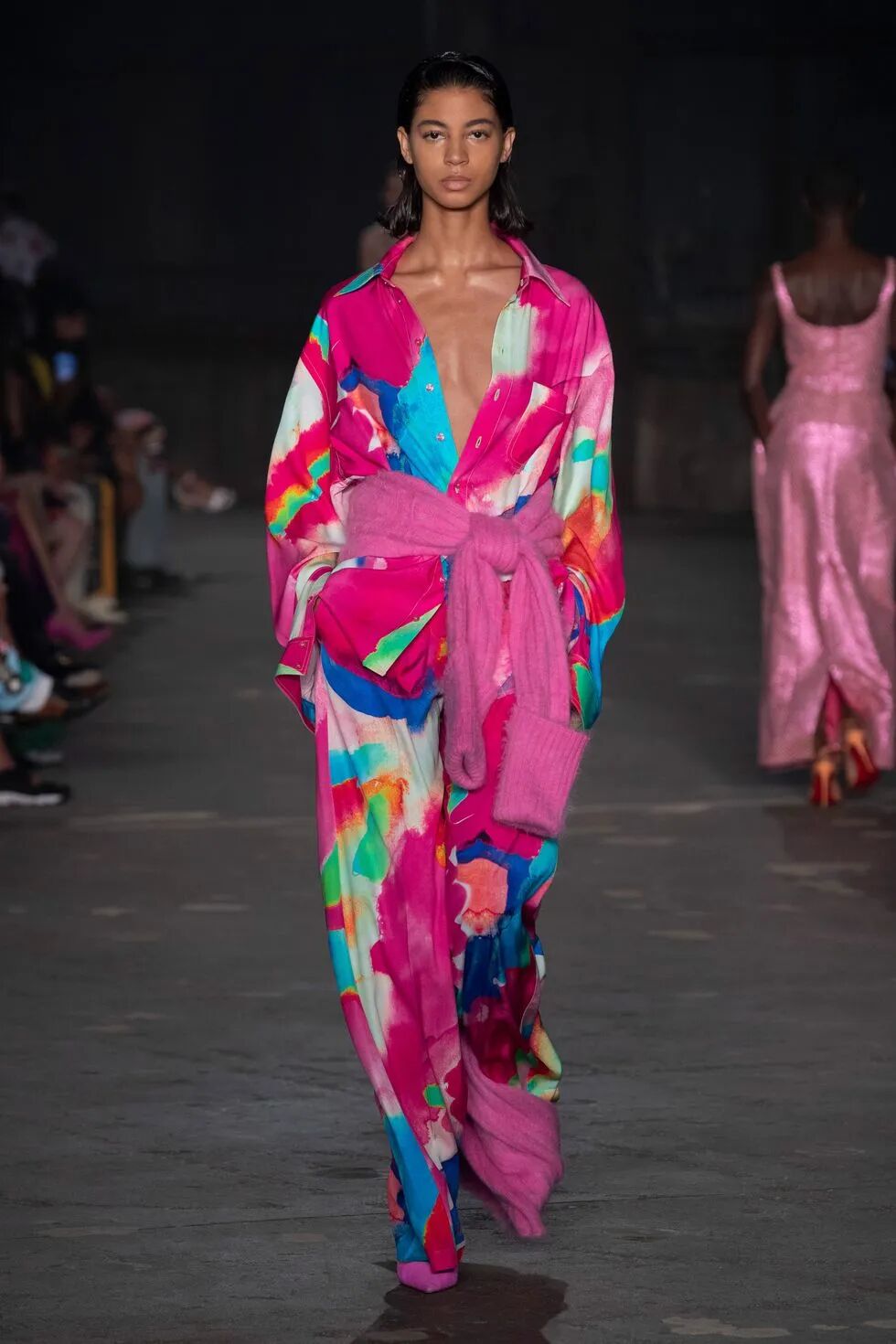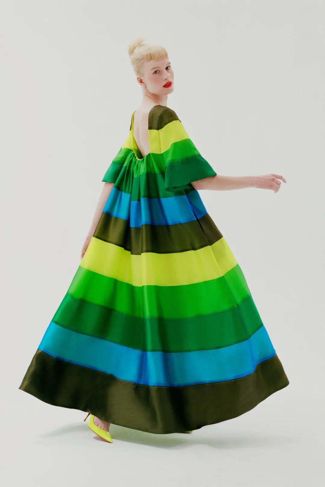 Christopher John Rogers 2023早春度假系列,通过视觉将快乐、多彩呈现在服装中,以表达人们对疫情后回归正常生活的欢欣雀跃。Karlie Kloss身穿紫蓝色大衣开场。整个系列将男性化服装与女性化服装混合,有大胆的花卉印花,也有艺术感十足的色彩和图形拼合,戏剧性十足。