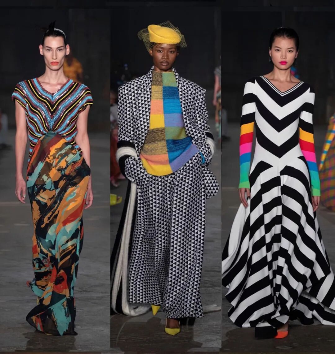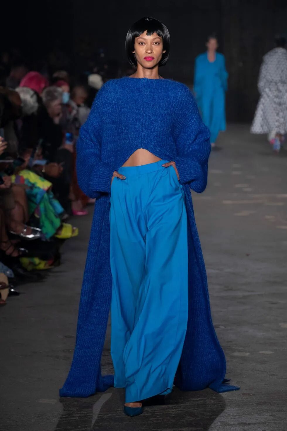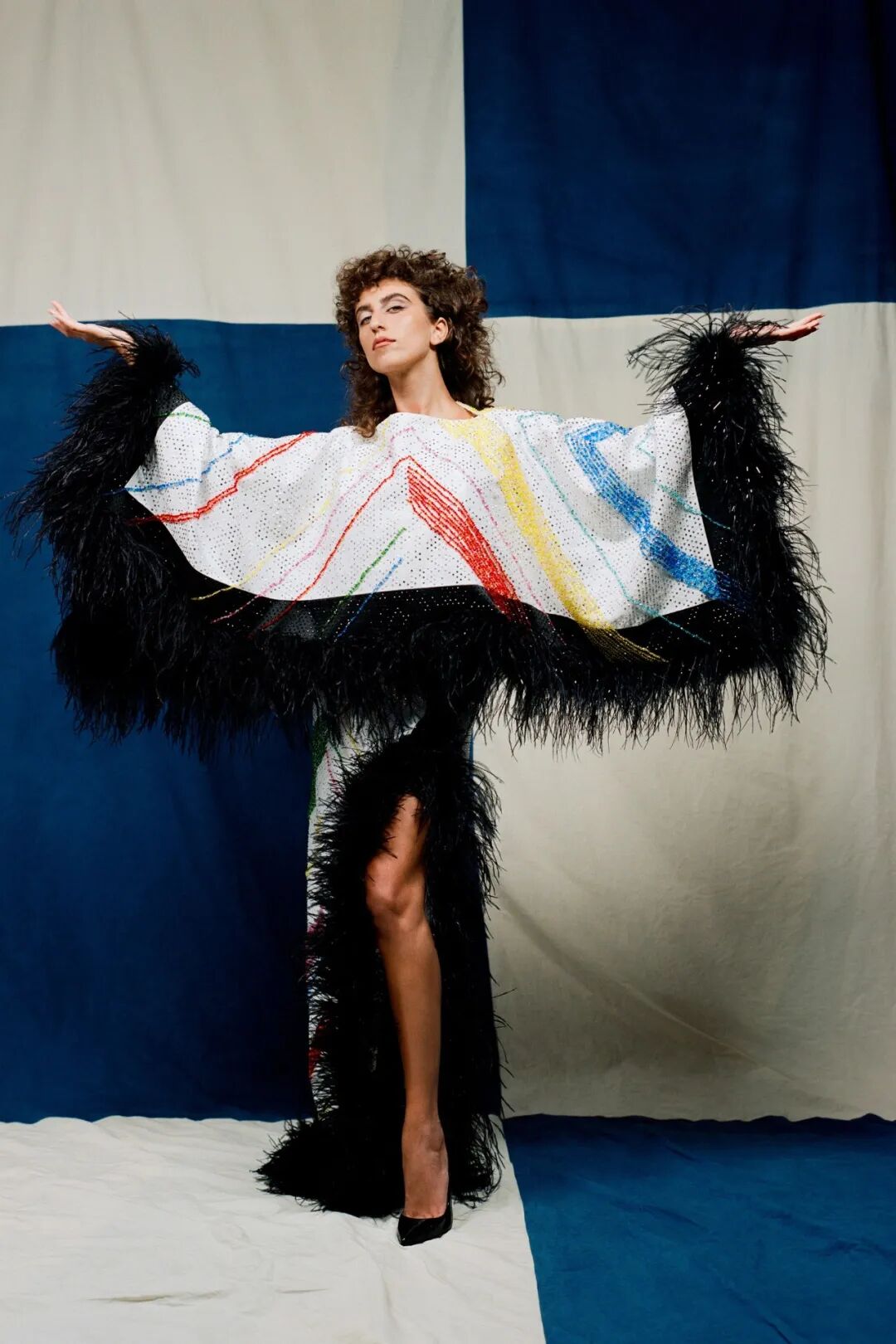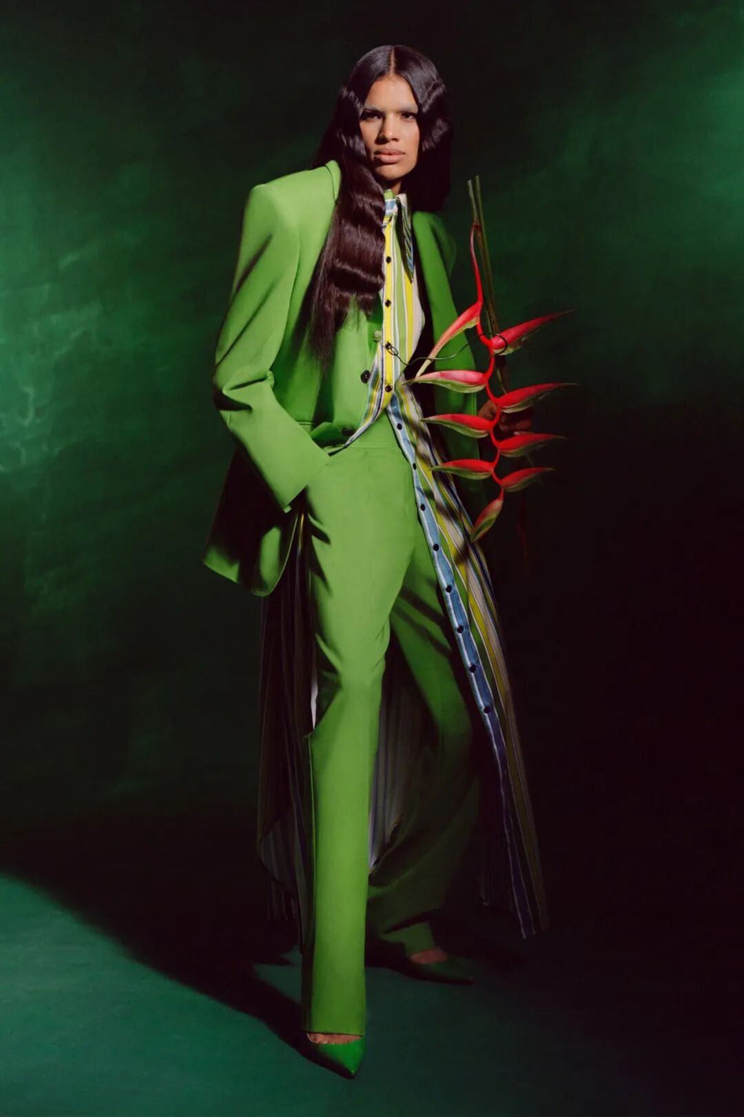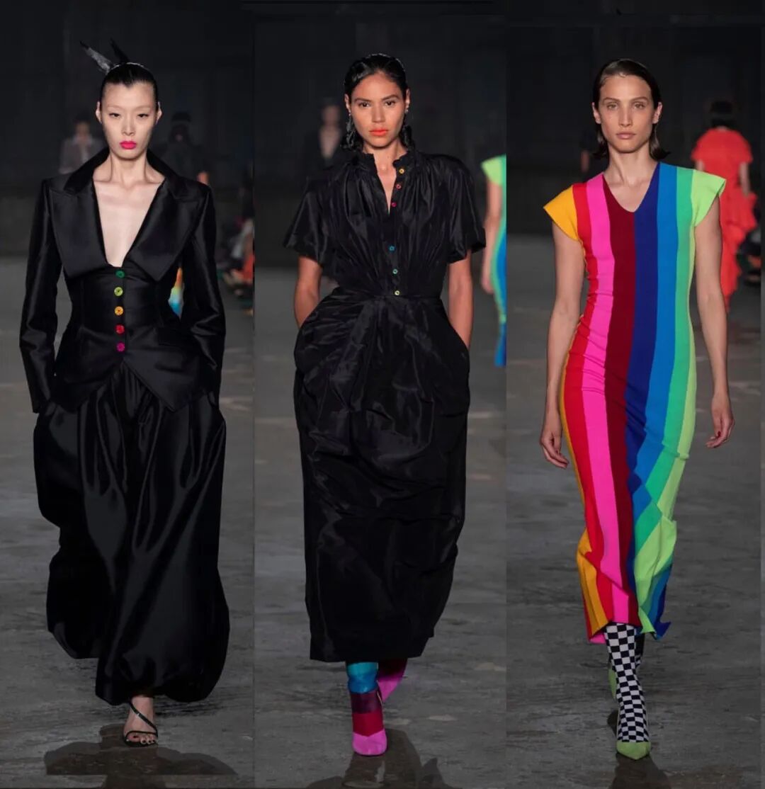 Christopher John Rogers 2023早春度假系列,通过视觉将快乐、多彩呈现在服装中,以表达人们对疫情后回归正常生活的欢欣雀跃。Karlie Kloss身穿紫蓝色大衣开场。整个系列将男性化服装与女性化服装混合,有大胆的花卉印花,也有艺术感十足的色彩和图形拼合,戏剧性十足。