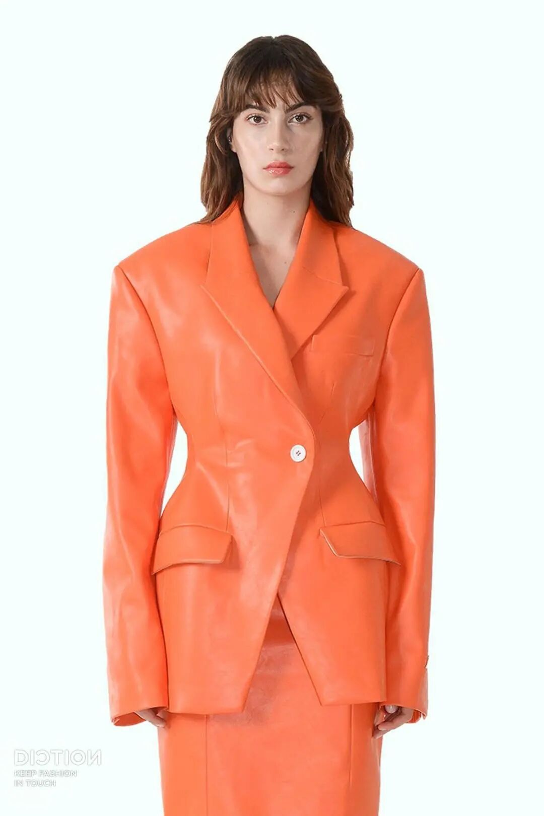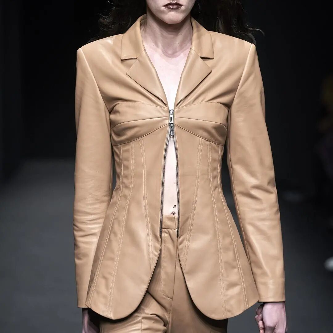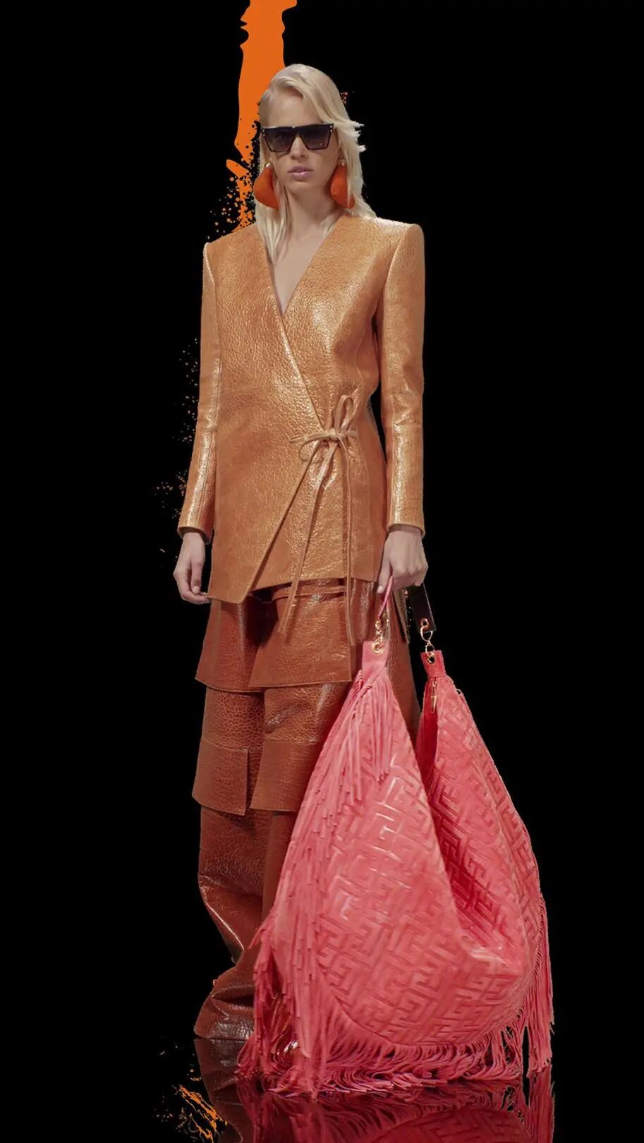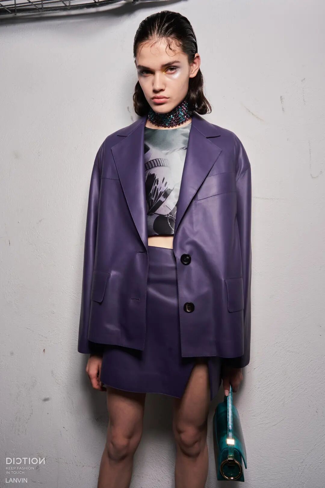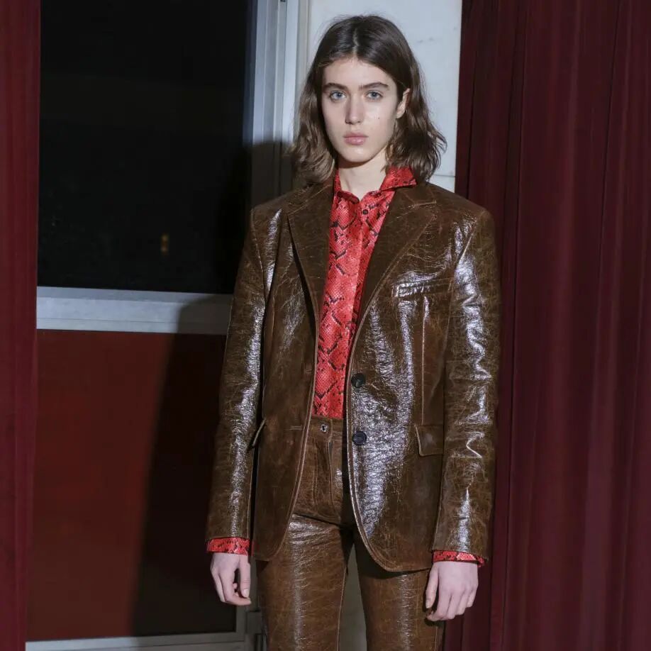 存在感极强的皮革是冬日出街的焦点,人造肌理褶皱感成为表现皮革面料设计的一部分,充满了故事感和年代感。亮皮材质减去西装固有的沉闷,无论是收敛的暗色调或者是惹眼的亮色皮质,甜酷气质都是视线的焦点。