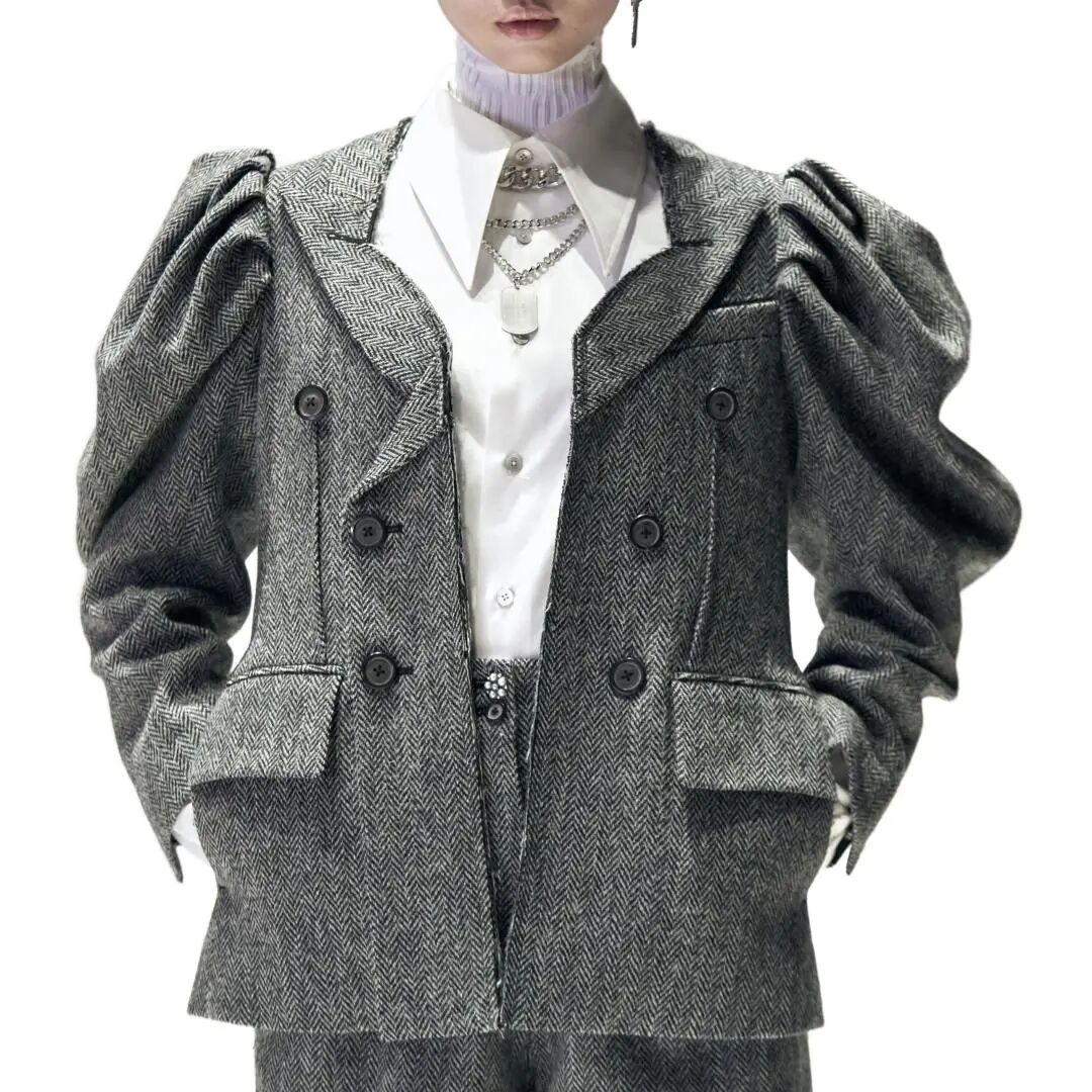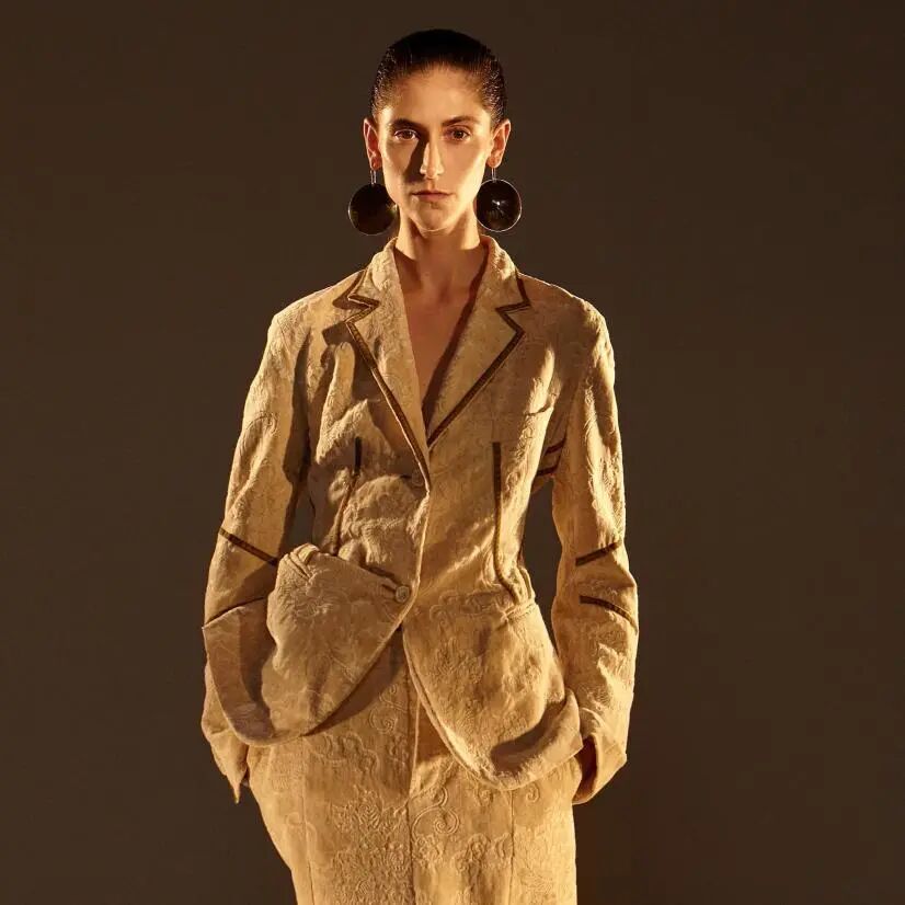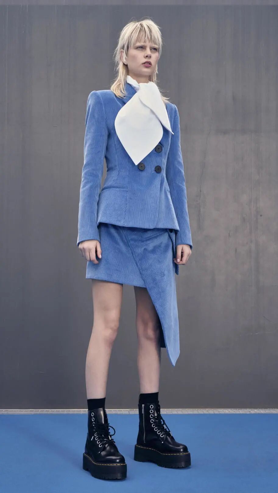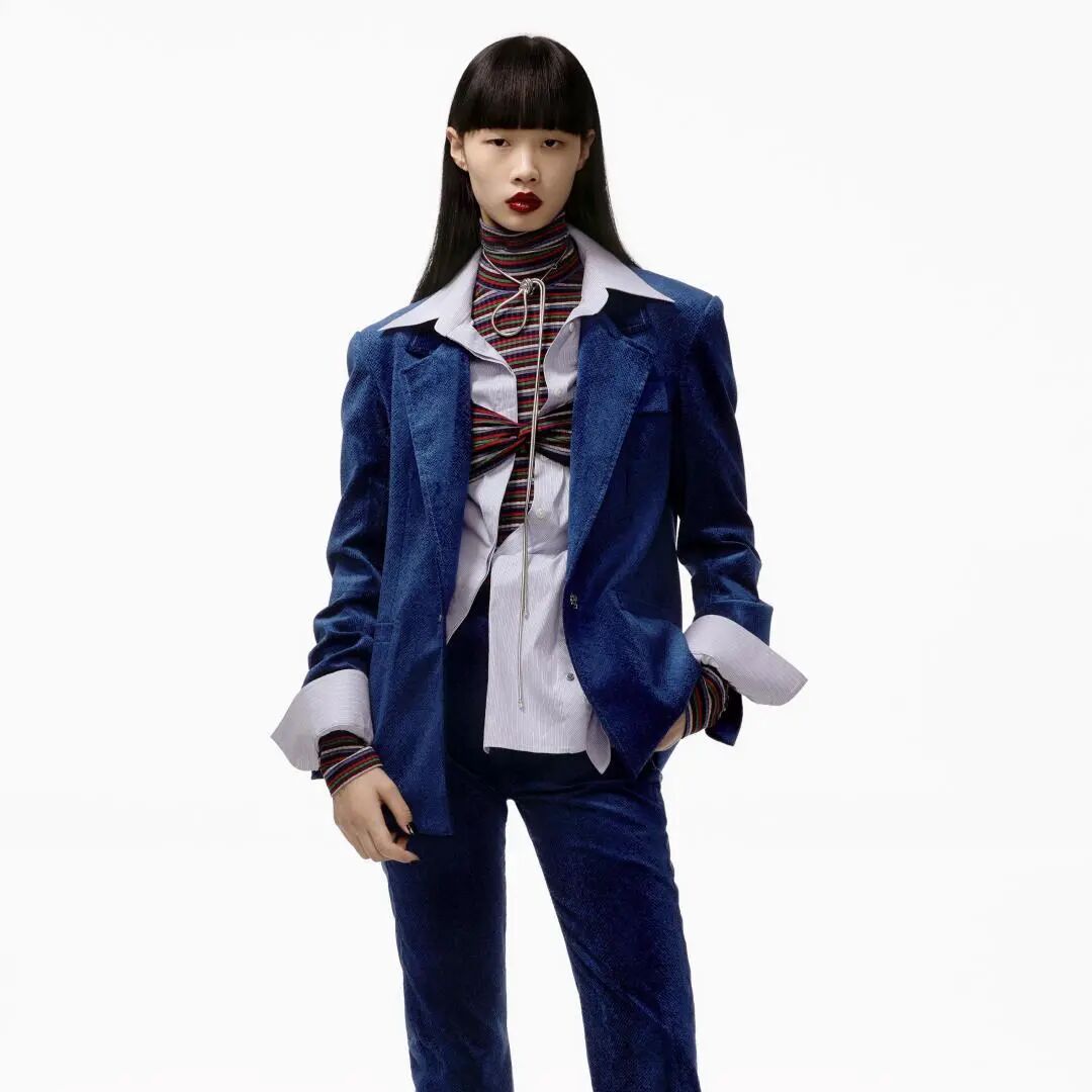 绒料作为秋冬季节的保暖又实用的面料,在西装单品面料运用中是不可或缺的存在。细腻光泽绒料加入温和褶皱增加视觉细节,坑条粗细不一的灯芯绒展现出质朴色调,高级实用。