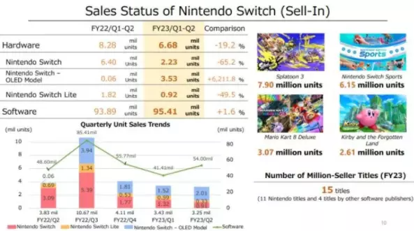 在上半年,任天堂的净销售额、净利润大约为6569亿和2304亿日元,同比分别上升了5%和34%。而在截至9月30日的三个月里,《斯普拉遁3》(Splatoon 3)的销量达到790万份,并已经成为有史以来卖得最快的Switch游戏。当季度内,《Nintendo Switch Sports》、《马力欧赛车8豪华版》和《星之卡比:探索发现》(Kirby and the Forgotten Land)分别卖出了615万、307万和261万份,在Switch主机上的销量排名第2到第4。