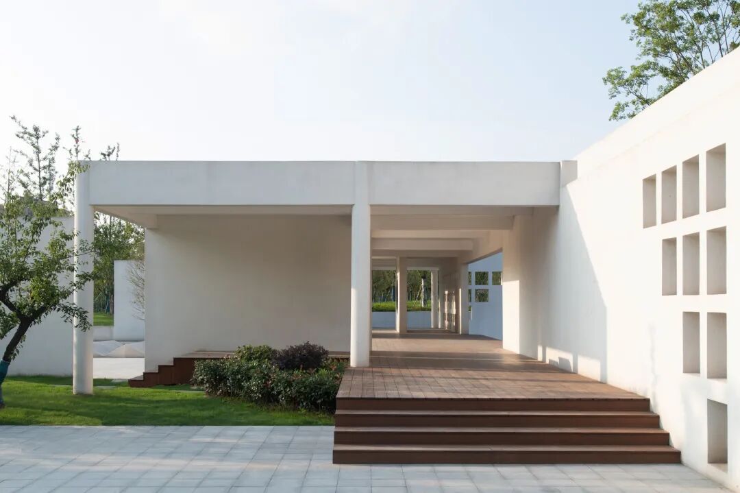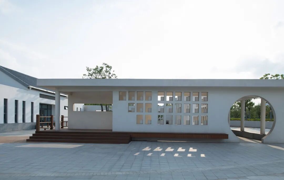 文化馆和琵琶长廊围合成一系列相连内庭,并向外分隔出音乐旱喷广场、观演舞台与以沈肇州代表曲目《飞花点翠》为名的海棠精品观赏园。用观演舞台构筑以家庭为单位的温馨场所,促进人们的互动参与及空间的融合交汇。