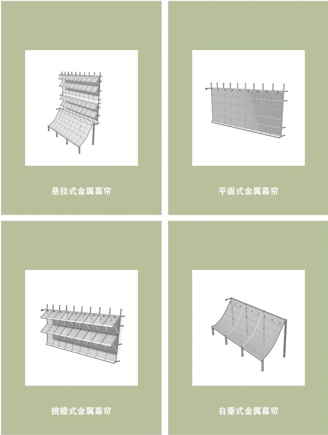 立面使用可拆卸的金属幕帘进行装饰,通过金属幕帘本身的自垂性,模拟风雨桥的挑檐,金属幕帘采用两种结构形式,以创造更丰富的形态感。金属幕帘使用三种不同的形式,通过三者的有机结合了,创造出更加丰富的层次和形态。