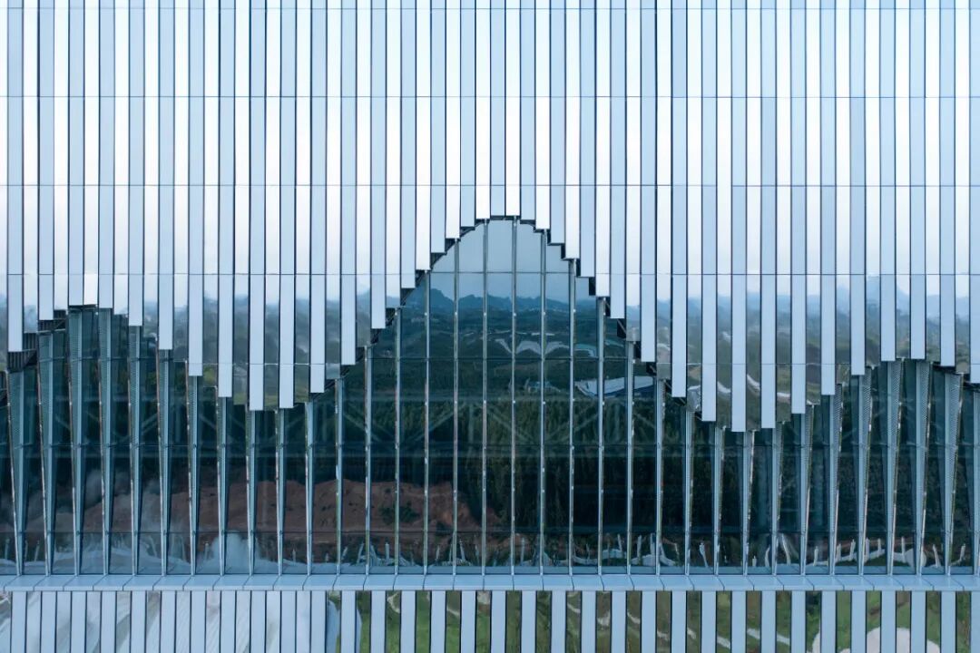 铝板幕墙采用镜面和哑光两种铝板格栅相间布置,形成强反射与弱反射的交替节奏,以条带化的抽象反射将周围环境映衬在建筑表皮之上。参数化的峰丛曲线作为基准线,设定每条格栅的长度,并且通过格栅的单向弯折来实现宏观上的三维曲面效果。这种处理方法有效地降低了工程难度和造价,同时又增加了立面的机械感与构成感,既符合建筑的工业理性,又呼应了建筑的人文属性。