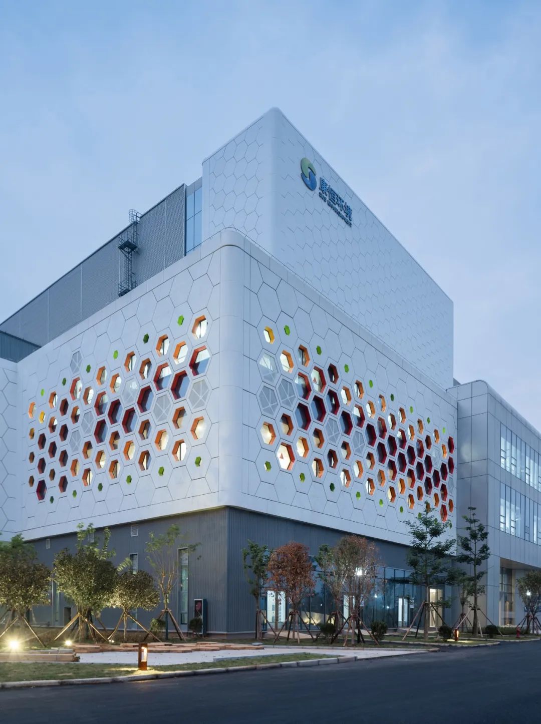 幕墙通过四种不同开口尺寸的六边形单元,对应四种渐变色彩营造出一种‘落英缤纷’的立面效果。厂房的主体部分采用波浪铝板进行包裹,形成独特的背景肌理,通过局部点缀六边形幕墙单元与裙房元素呼应,在保证立面丰富性的前提下有效地控制了施工成本。