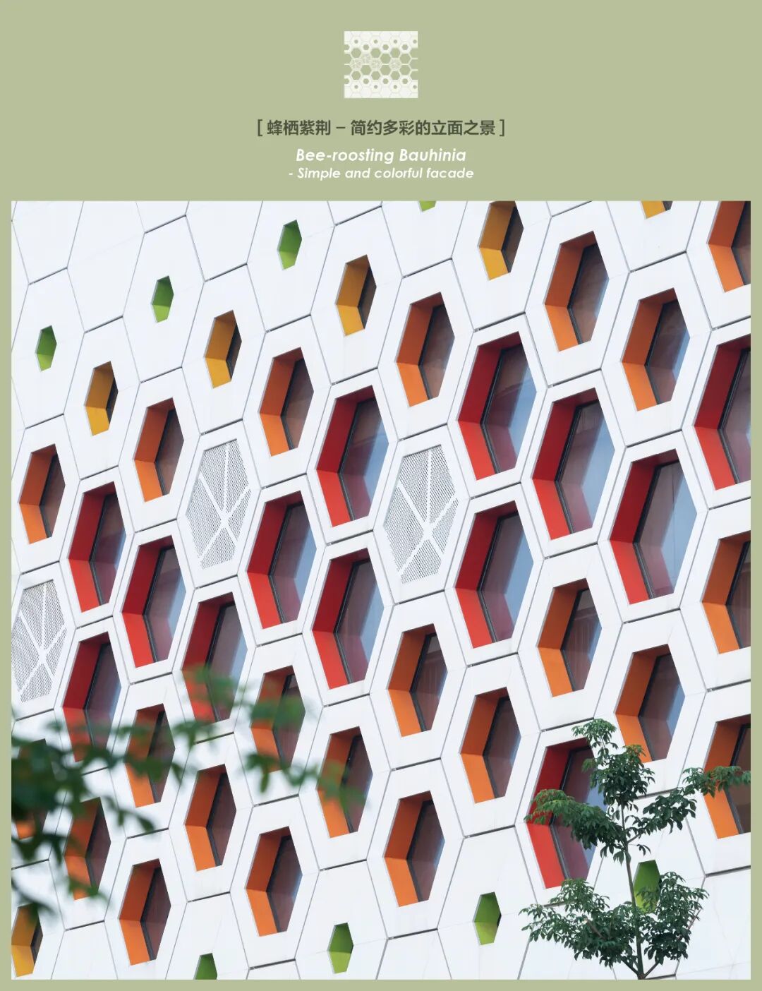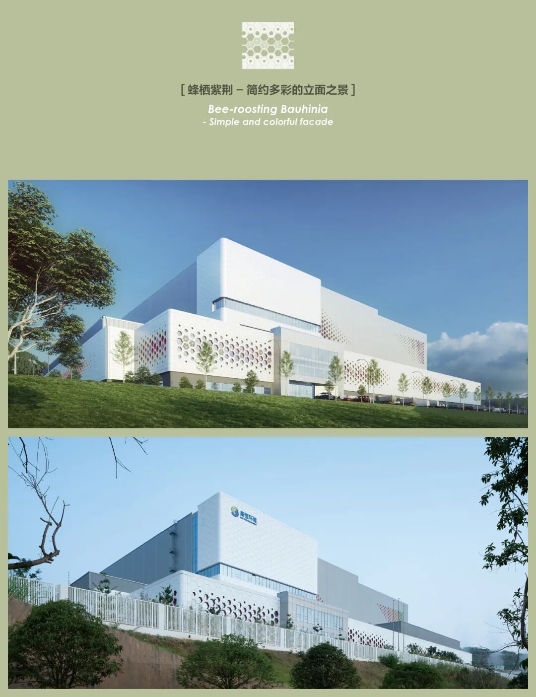 方案试图将柳州市花‘洋紫荆’与‘蜂巢’的意向融入在建筑的立面中,用白色的渐变蜂巢幕墙包裹厂房裙房部分,用柔和的凹凸纹路形成‘蜂巢’与‘花瓣’点缀其中。