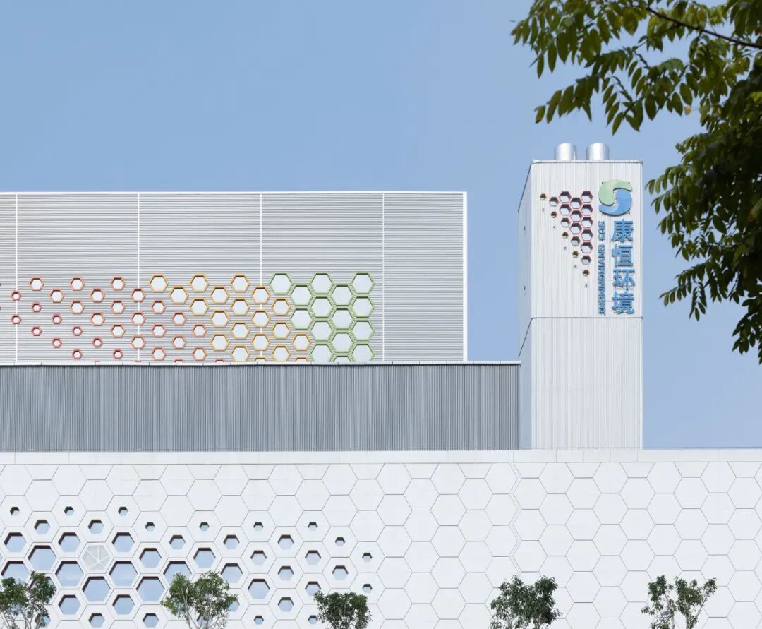 设计试图将紫荆花与蜂巢的意向同时融入在建筑的立面中,用柔和的凹凸纹路形成“蜂巢”包围建筑,并用“花瓣”点缀其中,让发电厂的立面成为有机,丰富的展示墙。通过灵活的表皮包裹不均匀的建筑体量,让建筑更具整体性。