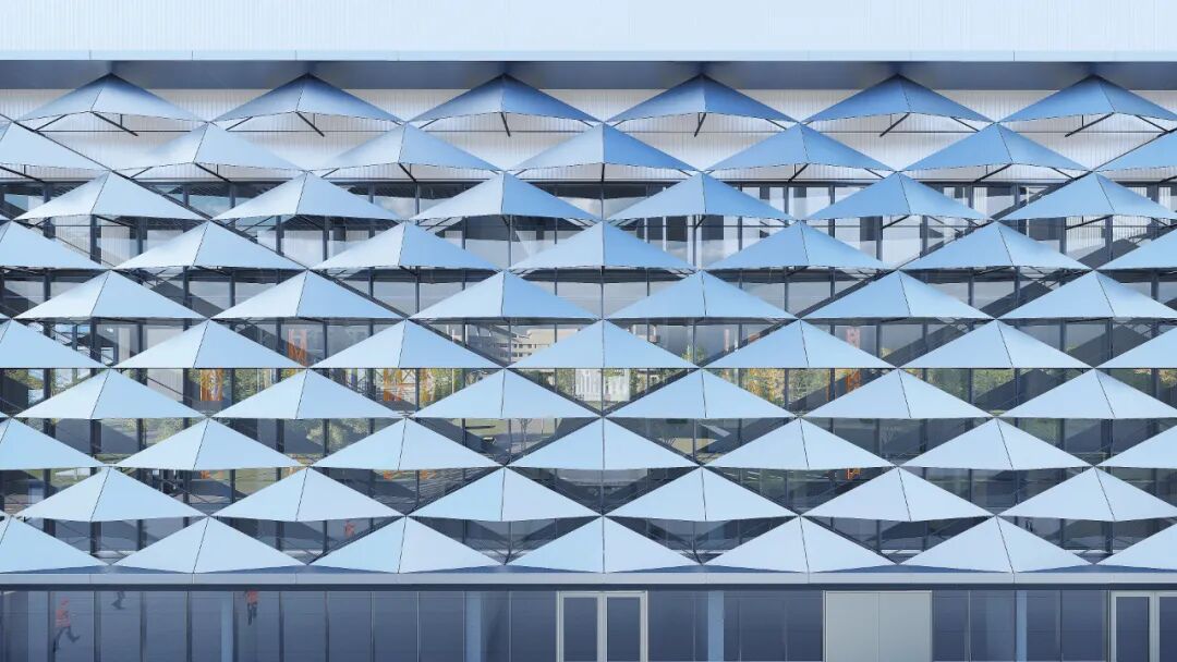 能量图谱:建筑的主立面,是整个厂房建筑的视觉重点,同时生成电能的功能模块也包含在这个体量之内。UUA将这部分幕墙设计成了“风铃幕墙”,由一个个相同的不锈钢风铃板阵列而成,受到空气的扰动整个立面将会随之舞动起来,在阳光的照耀下,主立面看上去会像是充满了能量,生动形象的将电能抽象为建筑语言给人们。