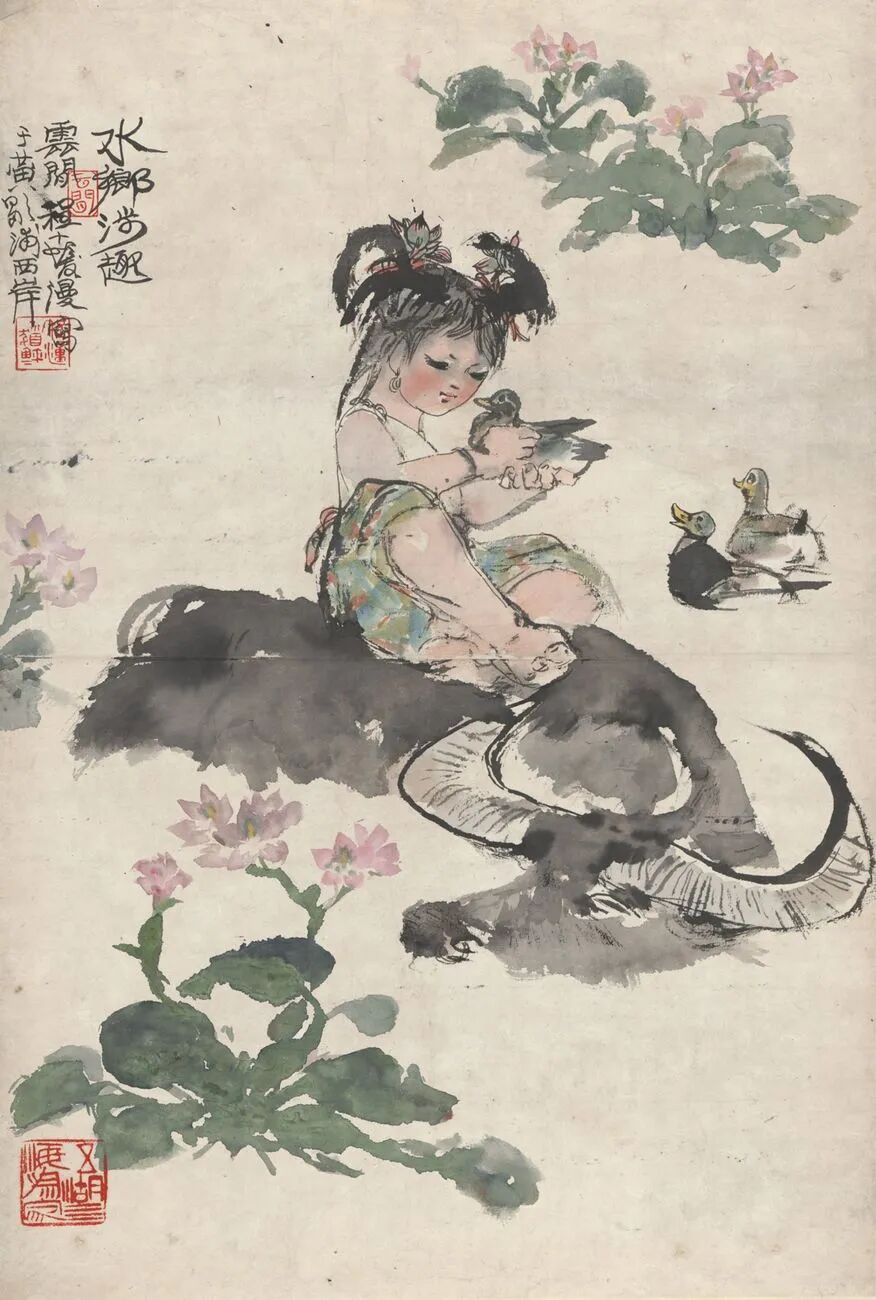 程十发 水乡涉趣图轴