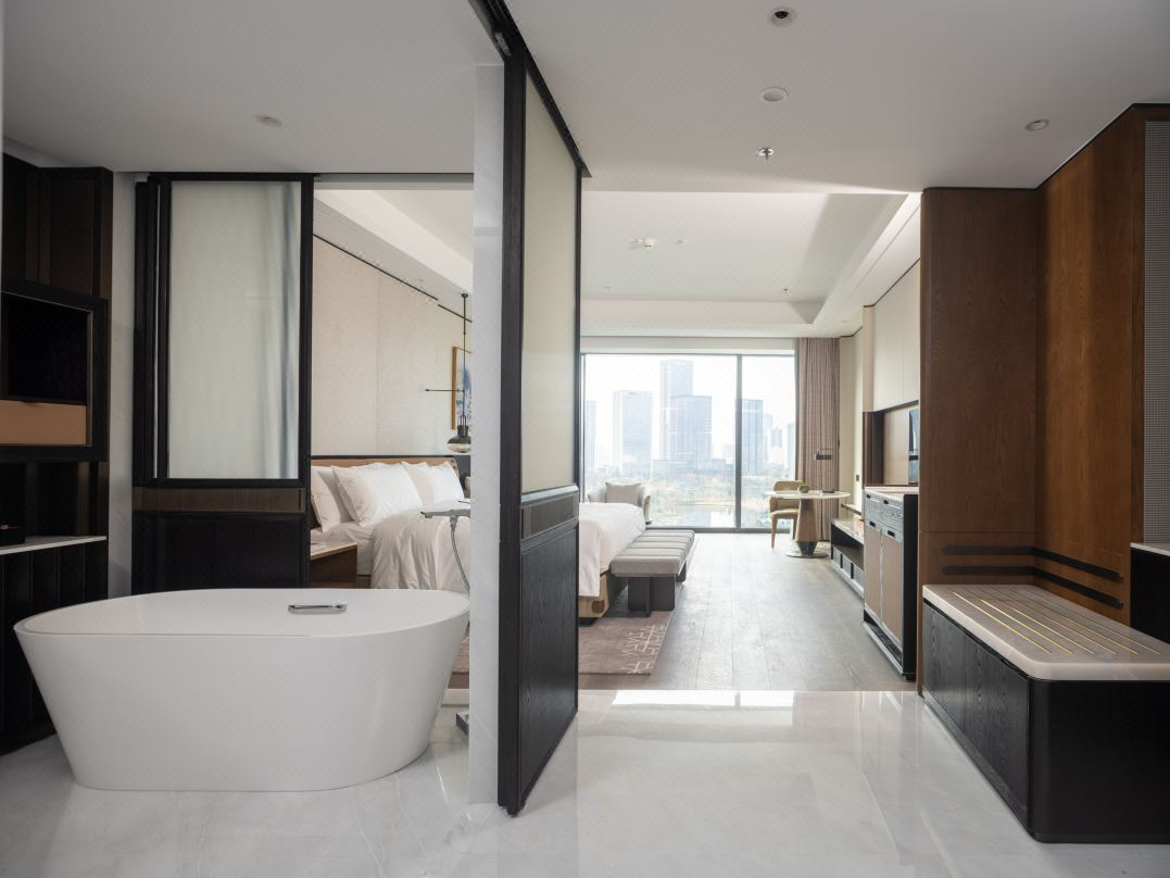 格栅设计的元素延续到了酒店客房,推拉式的设计贯通洗手台、客房和阳台,让整个视野得到开阔延伸。宁海喜来登酒店共拥有322间客房,包括面积50平方米起的315间现代舒服的客房和套房及7幢独栋别墅。