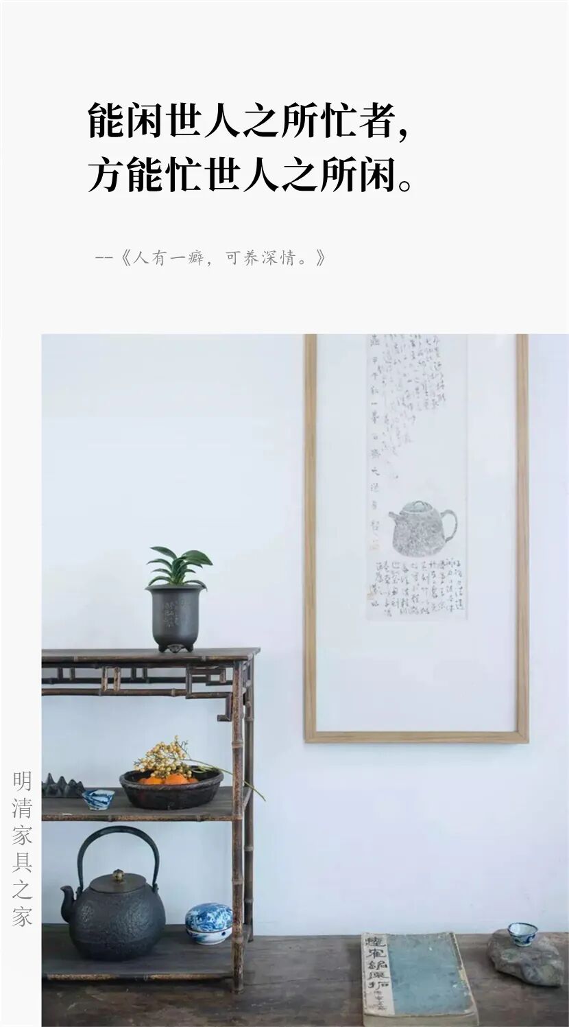 楼上看山,城头看雪,灯前看月,舟中看霞,月下看美人……追求精致生活,以及此时文人的情趣在器物上的体现,足以让我们体会到那时家具、陈设、生活之美了。所谓:才思一缕,片花寸草,岁月晴照;情趣几分,遥水近山,不遗玄想。