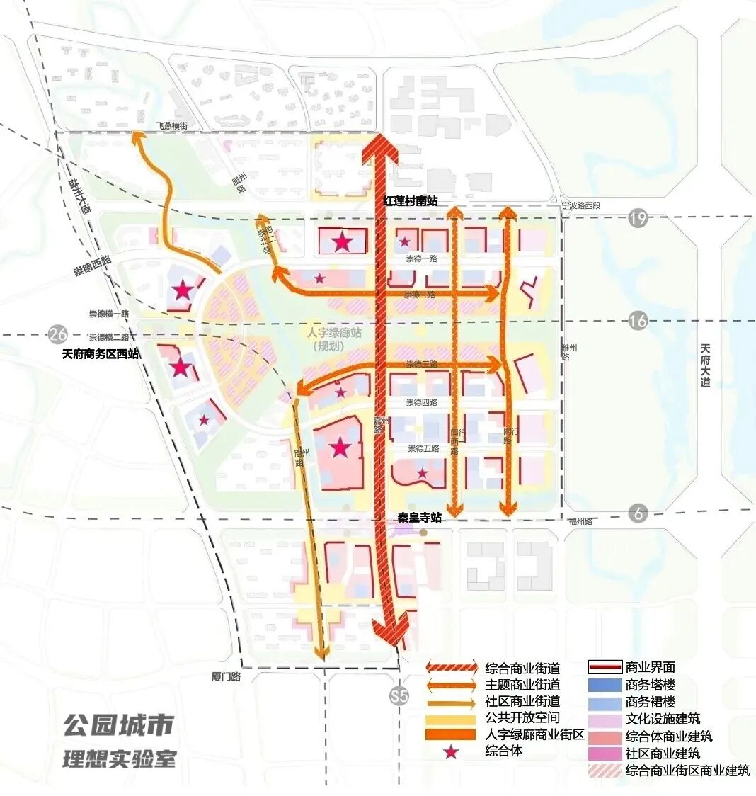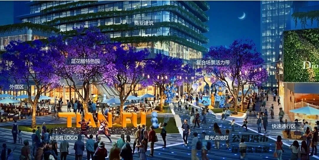 在商业街道体系方面,人字绿廊以四川传统街巷肌理打造低密度商业街区,形成具有“天府味、世界范”,集聚时尚餐饮、潮流零售、休闲文化体验业态的公园式街区。