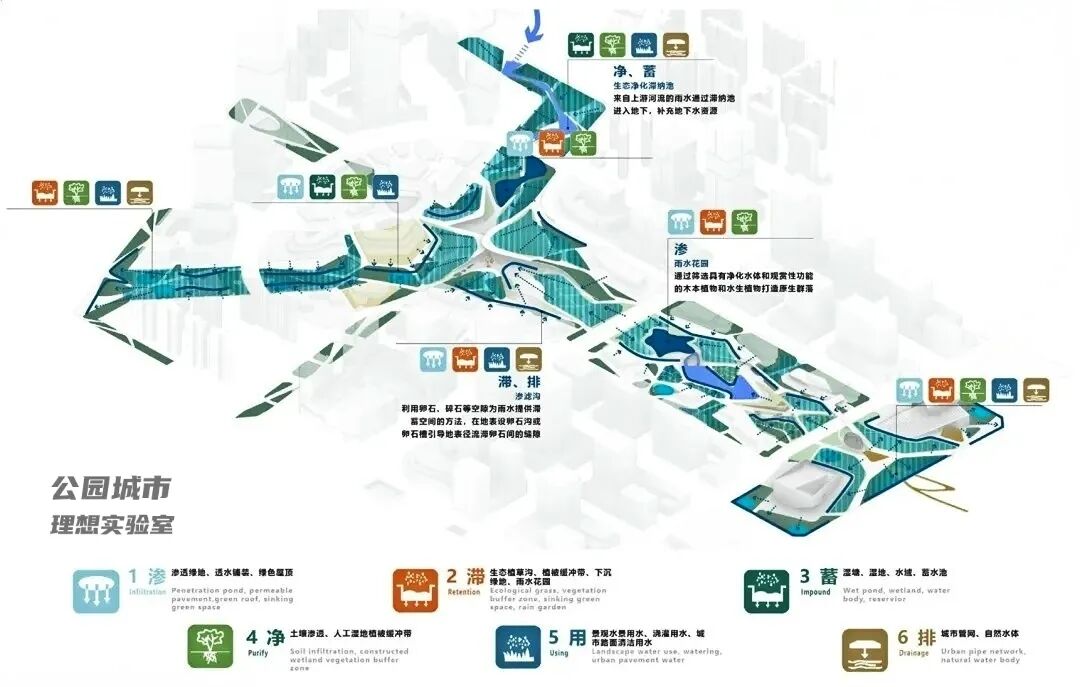 此外,人字绿廊还将通过“渗、滞、净、蓄、用、排”等水文循环措施,打造雨水花园。在减轻夏季洪涝期土壤负担的同时,有效促进水资源的循环利用,铸就生态安全的保护屏障。