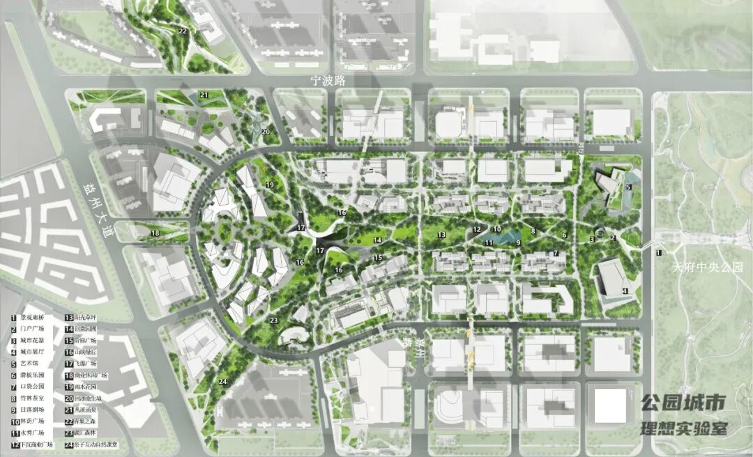 同时,人字绿廊连接引入周边毛家湾森林公园、锦江生态带、鹿溪河生态带等自然绿地水系,交织塑造城市绿地的弹性空间。