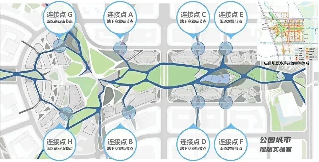 人字绿廊结合了两侧现状、规划和人群需求,整体形成“一主、七辅”的商业街道体系,并在街道中植入科技化的景观、智慧化的公共便民设施。