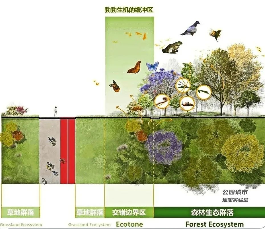 通过植被渗透打造生态缓冲区,提供支持物种跨越与自然对话的生态缝隙