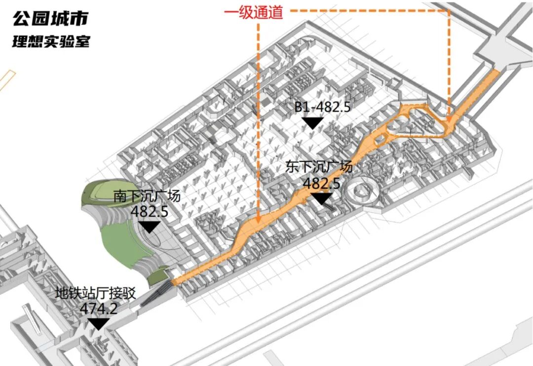 项目结合城市功能,在负一层设置了公共通道及下沉广场,负二层设置地下车行环道。