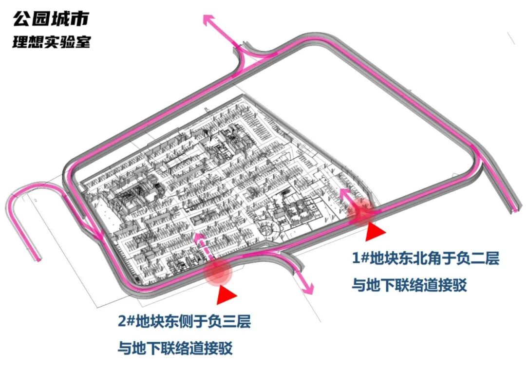 负二层设置地下车行环道,并在地块外围设置地下车行联络道,与地块有接口相连,优化了车行路线,减轻城市交通压力。