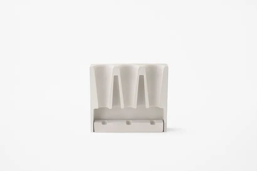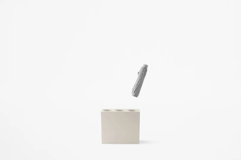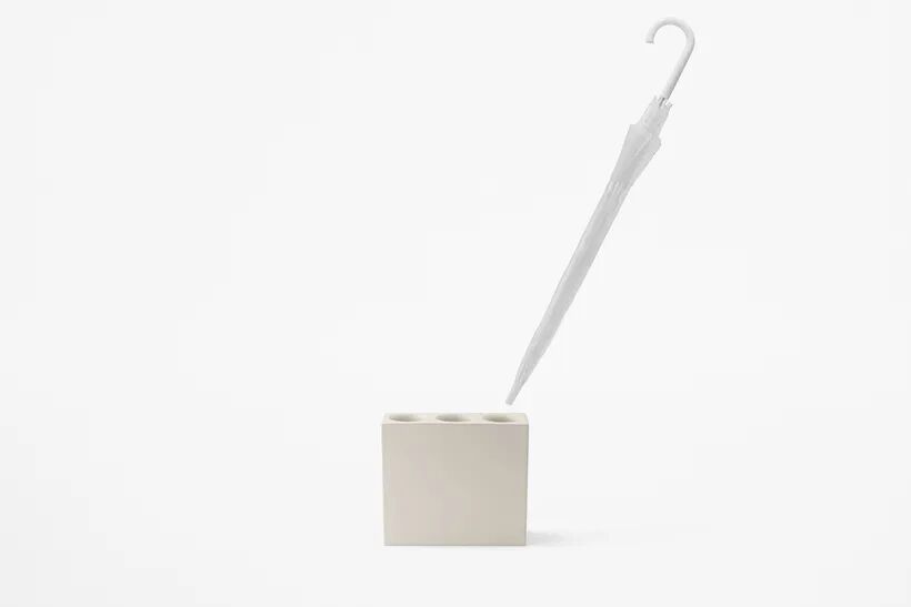 伞架可以放置3把伞的主体,是即使追加多把伞排列也不会有不协调感的方形形状。由两个零件构成,通过抬起外侧的零件,可以将积存在内侧接水托盘的水倒掉。由于在材料中使用含有石粉(石膏)的聚石灰,所以在保持能适应任何环境的光滑外观的同时,还可以具有作为伞架所需的"沉甸甸的稳定感"。