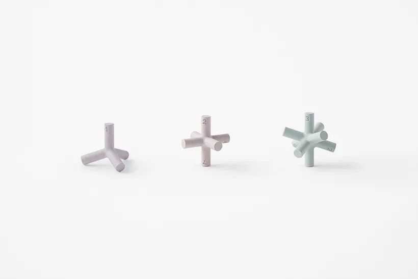 现代的骰子以方块状为主流,但在古代使用的骰子中也出土了很多棒状的骰子。Nendo工作室从这里得到灵感,设计了从中心呈放射状分支的"棒"来表现数量的3种骰子。