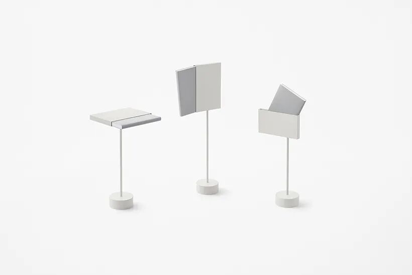 将书的轮廓原封不动地保留下来,使其漂浮在空中而诞生的"一本书大小的书架"。不仅仅是没读完的书,还为了暂时放置杂志、文件、智能手机等桌面上的小东西类,设计了3种形状作为一组小小的"物品休息空间"。