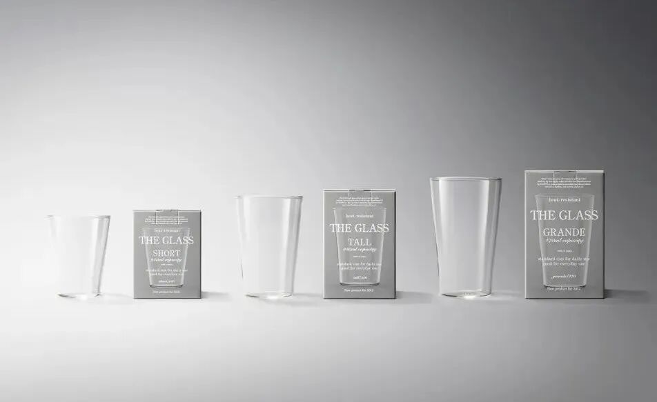 水野学设计的THE GLASS水杯没有复杂的装饰,只用3种大小不一的规格,满足不同的饮用需求。