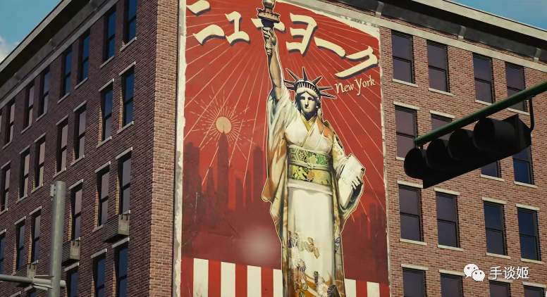 悠扬的歌曲,配合的是魔幻而富有想象力的文化融合,游戏中的美国地标都被赋予了日本文化的影子,比如这张贴在美式公寓楼上的自由女神像的广告牌,居然身着一席和服。