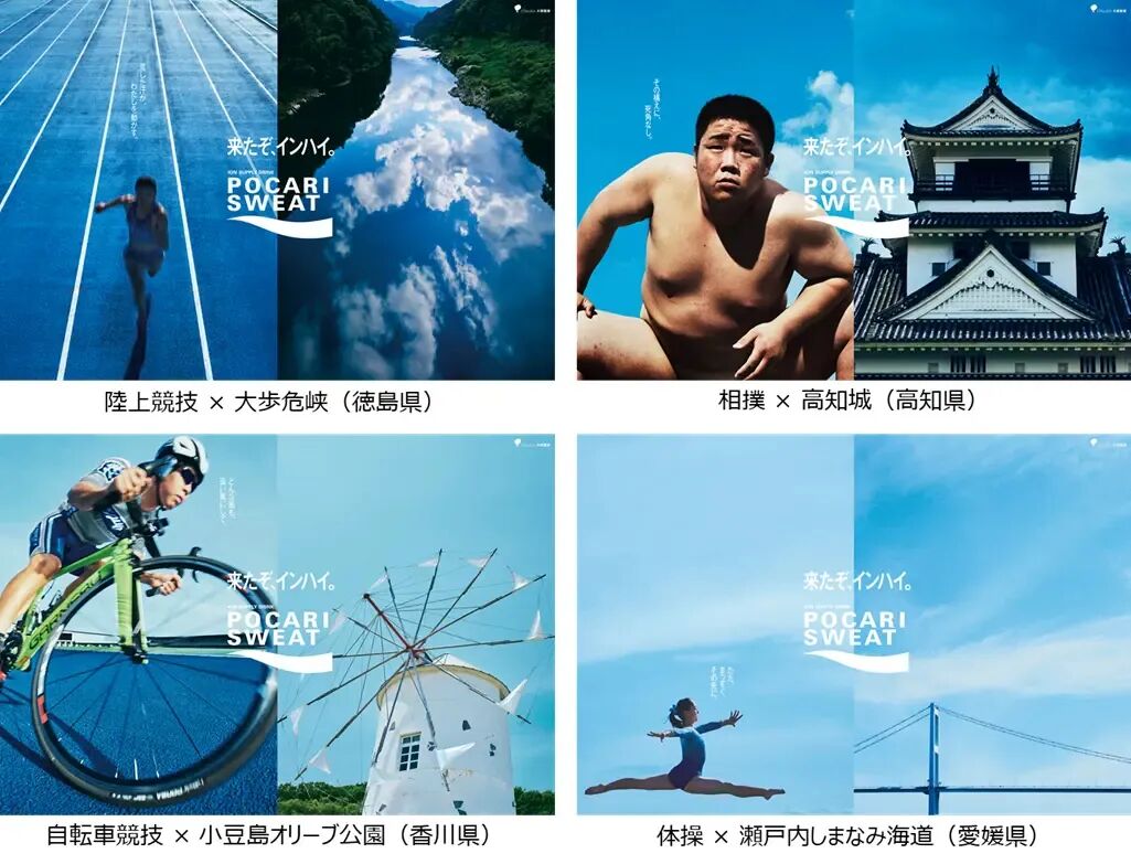 像是「体操」就是在爱媛县的濑户内しまなみ海道拍摄,选手做出一字马的跳耀之姿,与笔直的桥梁如出一辙;