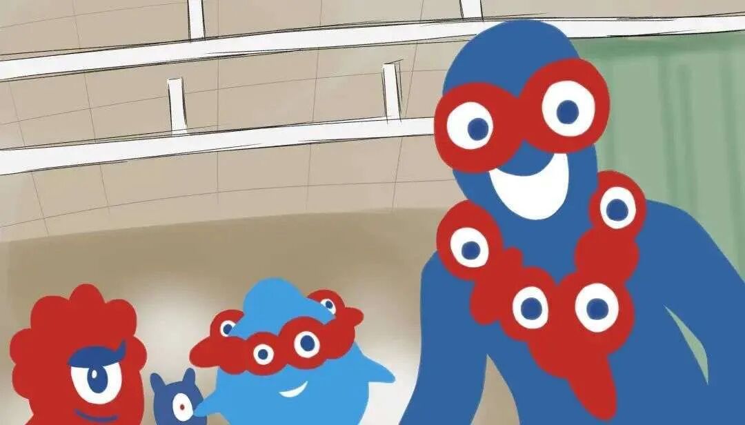 日本官方的解释是:这是几个充满活力的、跳跃的形象是细胞。