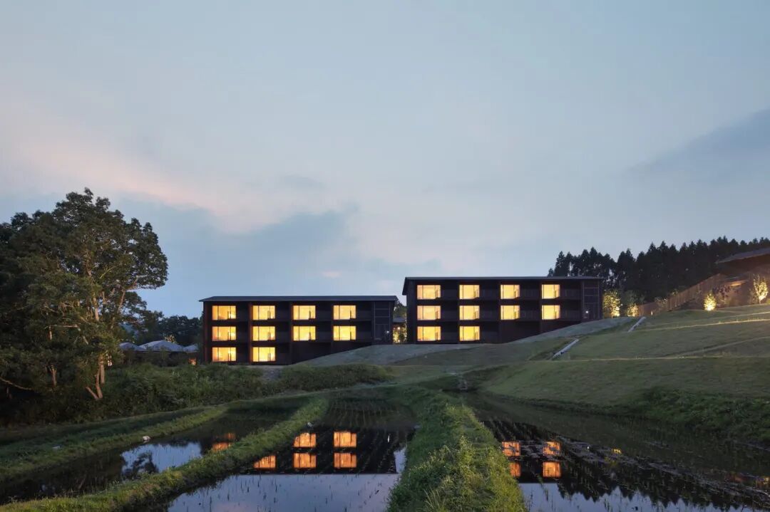 项目位于著名的大分县“Yufuin”温泉区,这里是日本具有代表性的人性化街道。但是直到昭和中期,它还是一个以稻田和牧场为主的农业村。在这里,我们设计了一家日式旅馆,以梯田稻田景观为主要特征,让游客体验当地原始的乡村。带有深檐的低层山墙屋顶建筑分散布置在梯田周围,木小木屋点缀在建筑群周围。低层建筑群的北侧环绕着橡树林,而南侧则面向山谷,在清晨弥漫着雾气。建筑东侧的露天温泉可以观赏到玉佛山。深绿色的外观让建筑消失在丰富的自然环境中。