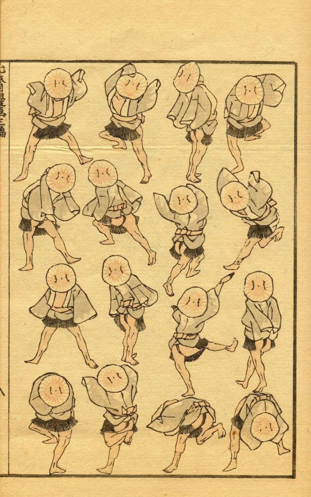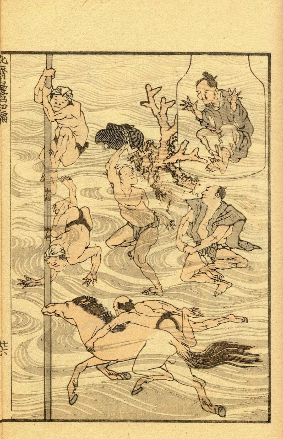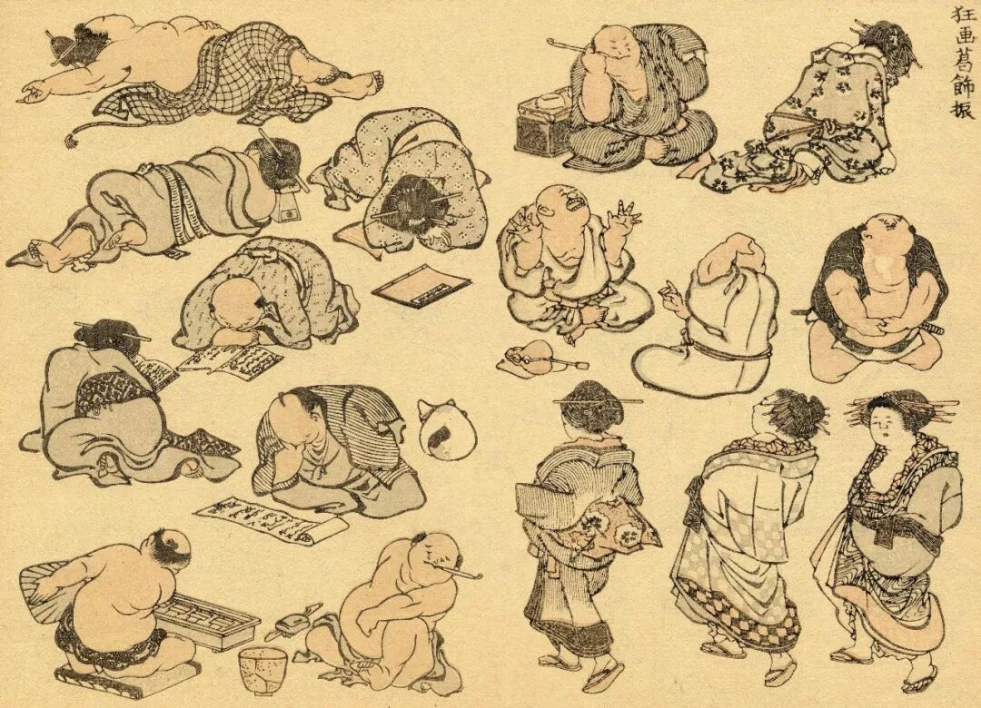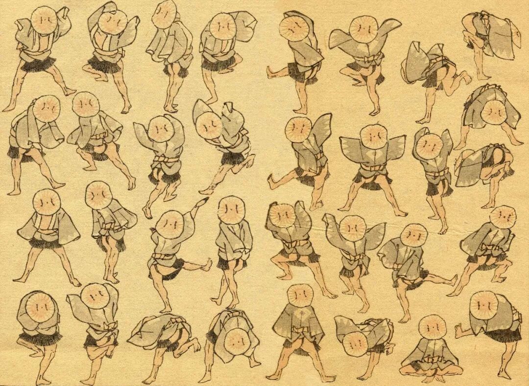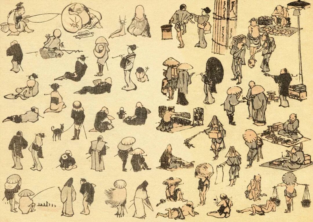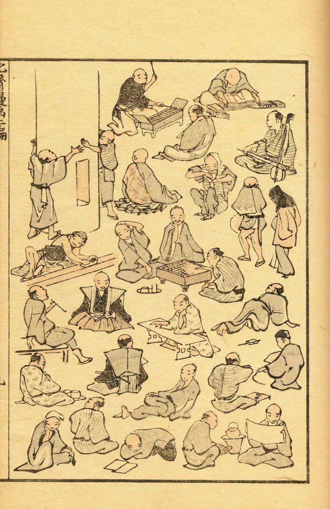 北斋漫画最大的魅力,就在于他对人世万物灵动瞬间的捕捉,并借由此细致地展示了万物诸相。他们的姿态、神情,都被描绘地栩栩如生,淋漓尽致。