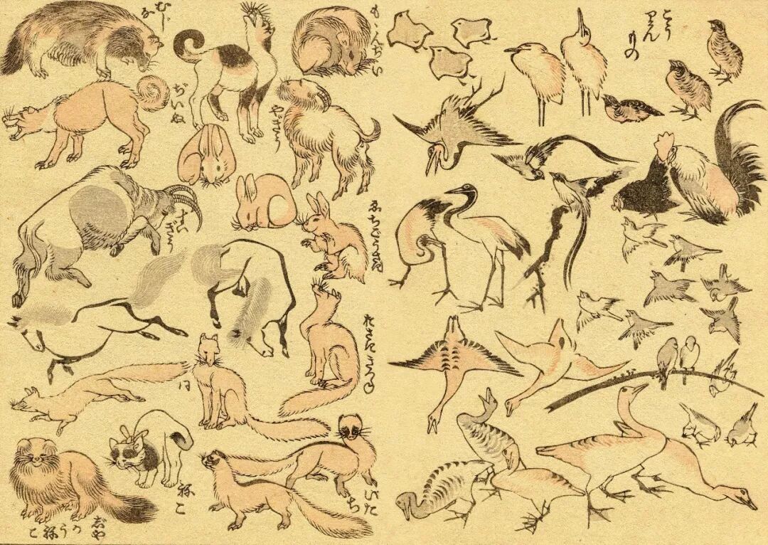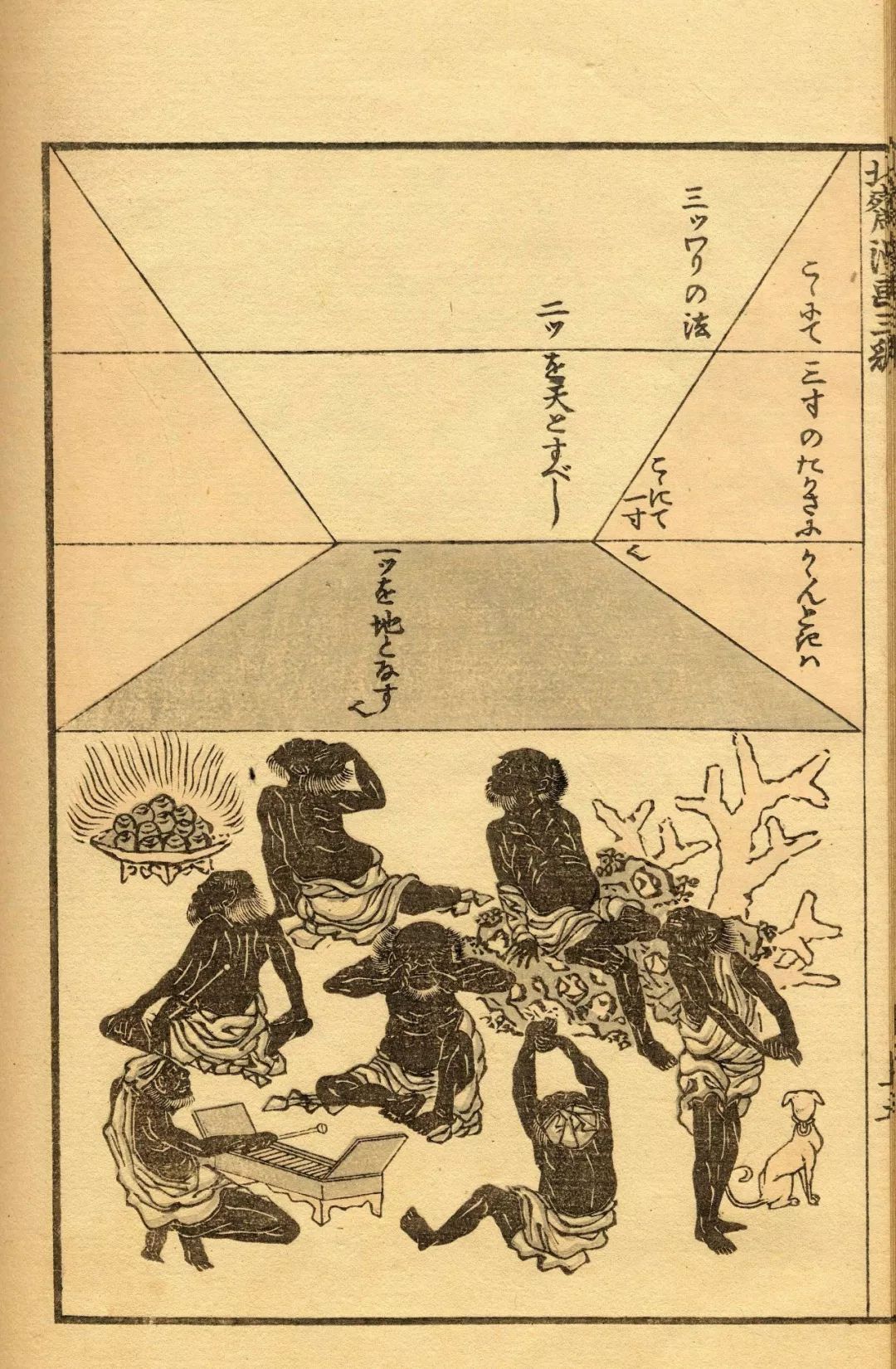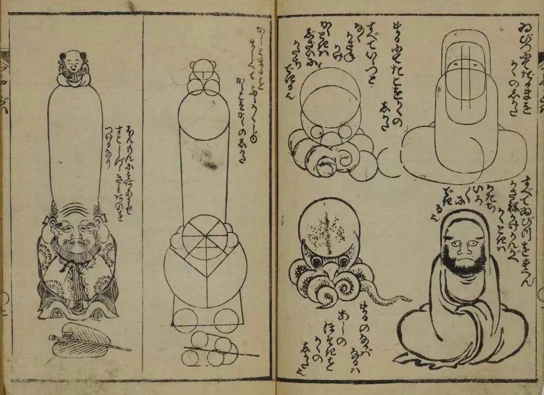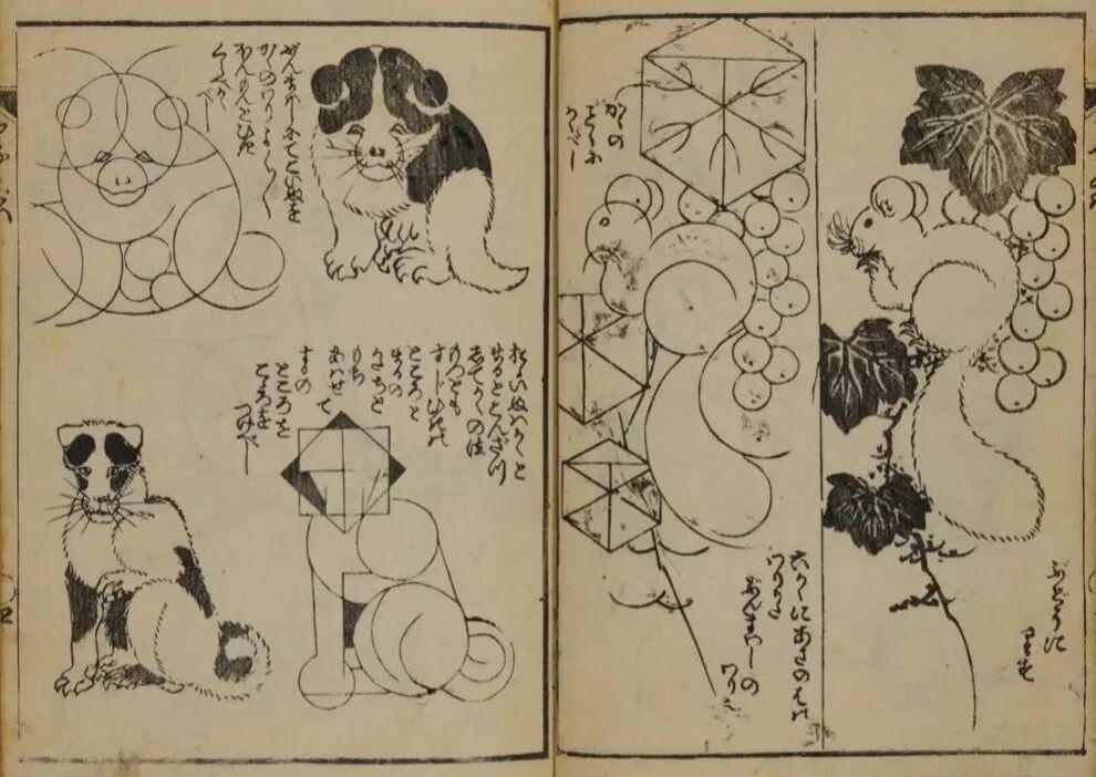 在出版他的第一版北斋漫画前,他还出版了一本名叫《略画早指南》,里面详细地记录了如何通过几何元素解构对象,进行作图。