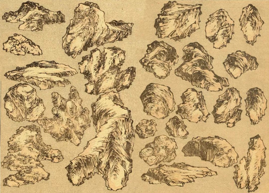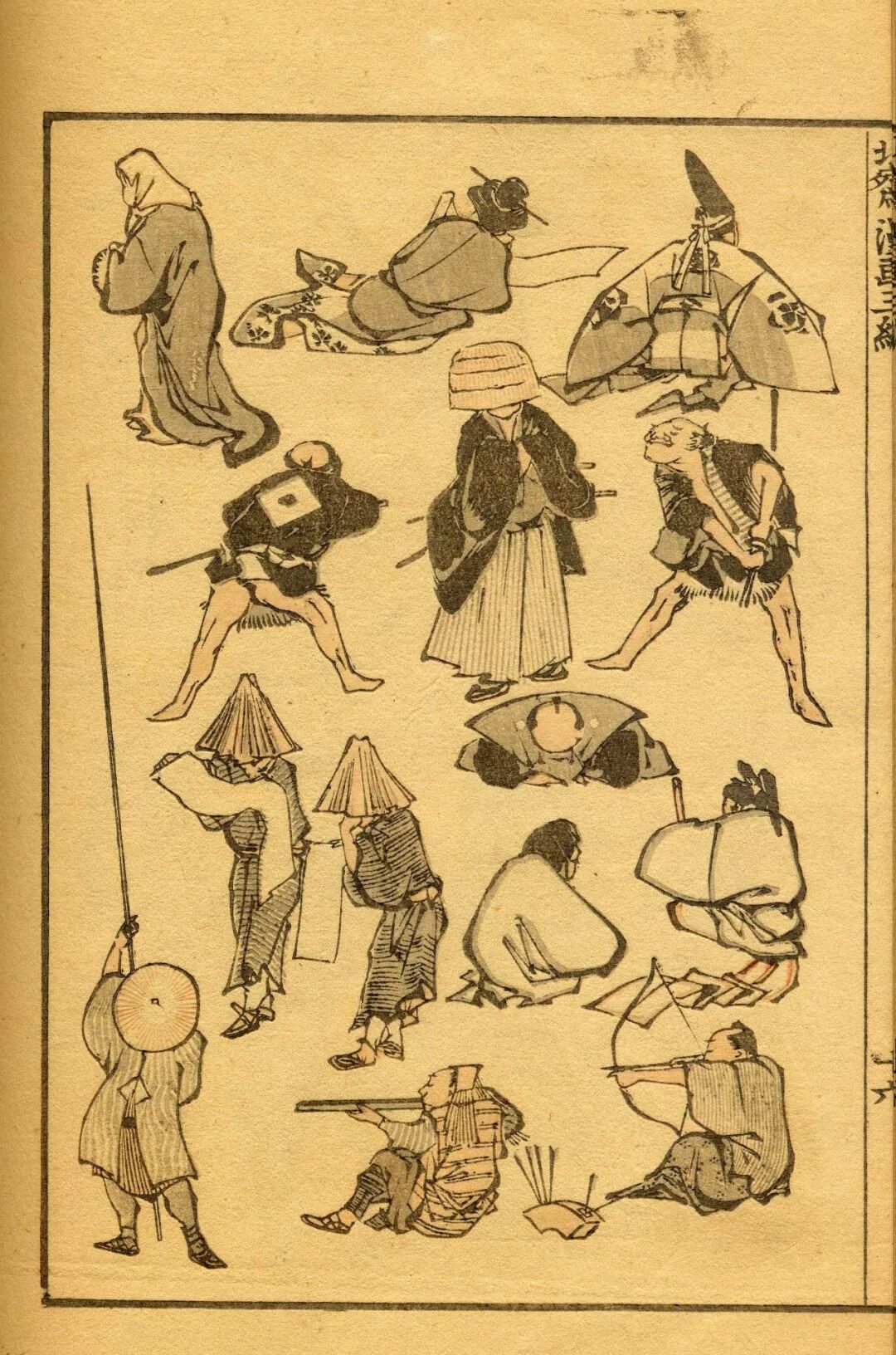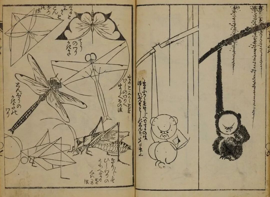 在出版他的第一版北斋漫画前,他还出版了一本名叫《略画早指南》,里面详细地记录了如何通过几何元素解构对象,进行作图。