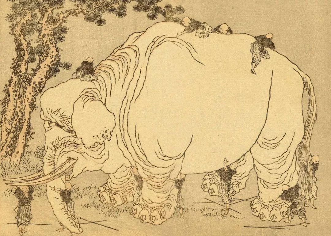 盲人摸象,象的巨大和盲人面部的安详、滑稽形成鲜明对比